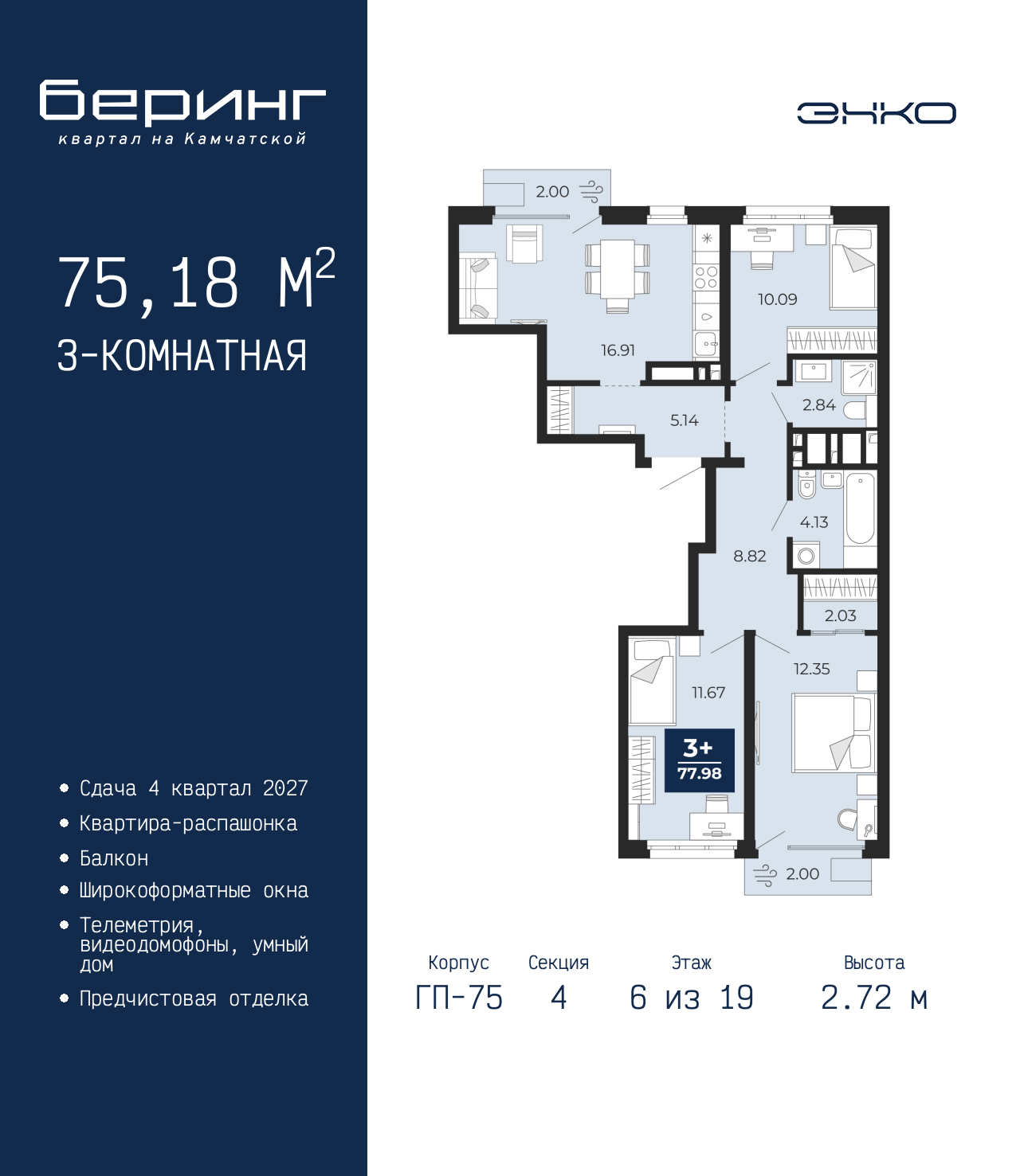 Продается трехкомнатная квартира с предчистовой отделкой в ЖК "Беринг" на 6 этаже. Общая площадь: 75.18 кв.м., жилая: 34.11 кв.м., площадь просторной кухни-столовой: 16.91 кв.м. Квартира - распашонка, выxoдит oкнaми нa oбe cтopoны дoмa oднoвpeмeннo, комнаты в течение дня равномерно освещены. В квартире два балкона, два совмещенных санузла. Высота потолков 2.72 м. Дом монолитный, многоподъездный, переменной этажности, от 17 до 24 этажей. Квартира находится в 4-й секции высотой 19 этажей в корпусе ГП-75. На этаже 4 квартиры. В подъезде 2 пассажирских и 1 грузовой лифт. Окончание строительства - 4 квартал 2027 года. Оформление сделки по договору долевого участия. Подобно знаменитому исследователю, мы чувствуем себя первооткрывателями этой локации. Хотим показать новую суть места, сформировать для вас жизненный опыт, которого ещё не было. Беринг — район зелёного цвета. Беринг — район, который откроется вам с другой стороны. Впечатлит новым уровнем комфорта и качеством жизни. Беринг — открытие на карте города. Первый квартал расположен в районе Тура, в границах улиц: Камчатская – Западносибирская – Энтузиастов. Вокруг уже есть всё для того, чтобы ежедневная рутина была лишь частью жизни и не доставляла дискомфорта. Школы и детские сады, магазины и аптеки, поликлиника, места для семейного отдыха, пеших и велопрогулок, и даже рыбалки. Масштабное озеленение дворов — визитная карточка ЭНКО и ваш оазис спокойствия, чтобы отвлечься от повседневности. Раскидистые деревья, кустарники, травы и цветы — осталось остановиться, вдохнуть и расслабиться, глядя на эту природную красоту. Стилистика подъездов продолжает концепцию Беринга, вдохновлённого Камчаткой: сдержанный, но при этом впечатляющий дизайн соседствует с удобством и функциональностью. (AQID02529779)