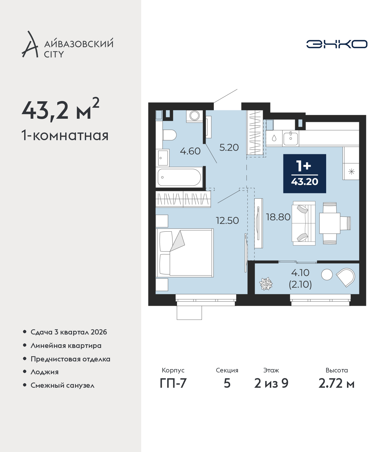 Однокомнатная квартира с предчистовой отделкой в ЖК "Айвазовский City" на 2 этаже. Общая площадь: 43.2 кв.м., жилая: 12.5 кв.м., площадь просторной кухни-столовой: 18.8 кв.м. Все окна выходят на одну сторону. В квартире одна лоджия, один совмещенный санузел. Высота потолков 2.72 м. Дом монолитный, многоподъездный, переменной этажности, от 9 до 24 этажей. Квартира находится в 5-й секции высотой 9 этажей в корпусе ГП-7. На этаже 7 квартир. В подъезде 1 пассажирский и 2 грузовых лифта. Окончание строительства - 3 квартал 2026 года. Оформление сделки по договору долевого участия. Новый жилой район располагается в живописном месте на берегу Туры в центральной части города. Принципиально новое пространство для жизни в центре современного города для тех, чьи мечты сбываются, кто нацелен на постоянный рост, перемены к лучшему для себя и своих близких. Каждая деталь Айвазовский City вдохновляет и заряжает на новые свершения: авторская архитектура, сбалансированная продуманная инфраструктура, дизайнерские дворы со спортивными и детскими площадками, парковые зоны с фонтанами, водный канал, украшающий центральный прогулочный маршрут района и многое другое. В 2019 года проект стал лауреатом престижной премии Urban Awards 2019 в номинации «Лучший строящийся региональный жилой комплекс бизнес-класса». Главная особенность Айвазовский City - соседство разных архитектурных школ в рамках одного дома. Изысканная классика, выразительная эклектика и оригинальный модерн - жить в одном из таких домов настоящий повод для гордости. Айвазовский City это идеальное сочетание комфорта, технологий и развитой инфраструктуры. Вход в подъезд возможен с улицы и со двора. Отправляясь на работу или за покупками, жители могут выйти с внешней стороны дома, а для прогулки с ребенком – со стороны двора. Экологически чистые материалы и энергосберегающие технологии, качественное освещение общественных зон, видеонаблюдение по всей территории жилого района (в том числе в подъездах, лифтах и в подземном паркинге), закрытые дворы с доступом только для жителей Айвазовский City. Часть домов в Айвазовский City будут оснащены подземным паркингом. Востребованный в нашем климатическом поясе формат хранения автомобилей защитит собственность владельца в любое время года. Аккредитация в банках: ОАО «Альфа-Банк», ПАО «Газпромбанк», «Сбербанк России», ПАО Банк «ВТБ», АО "ДОМ.РФ" и других. (AQID02343188)