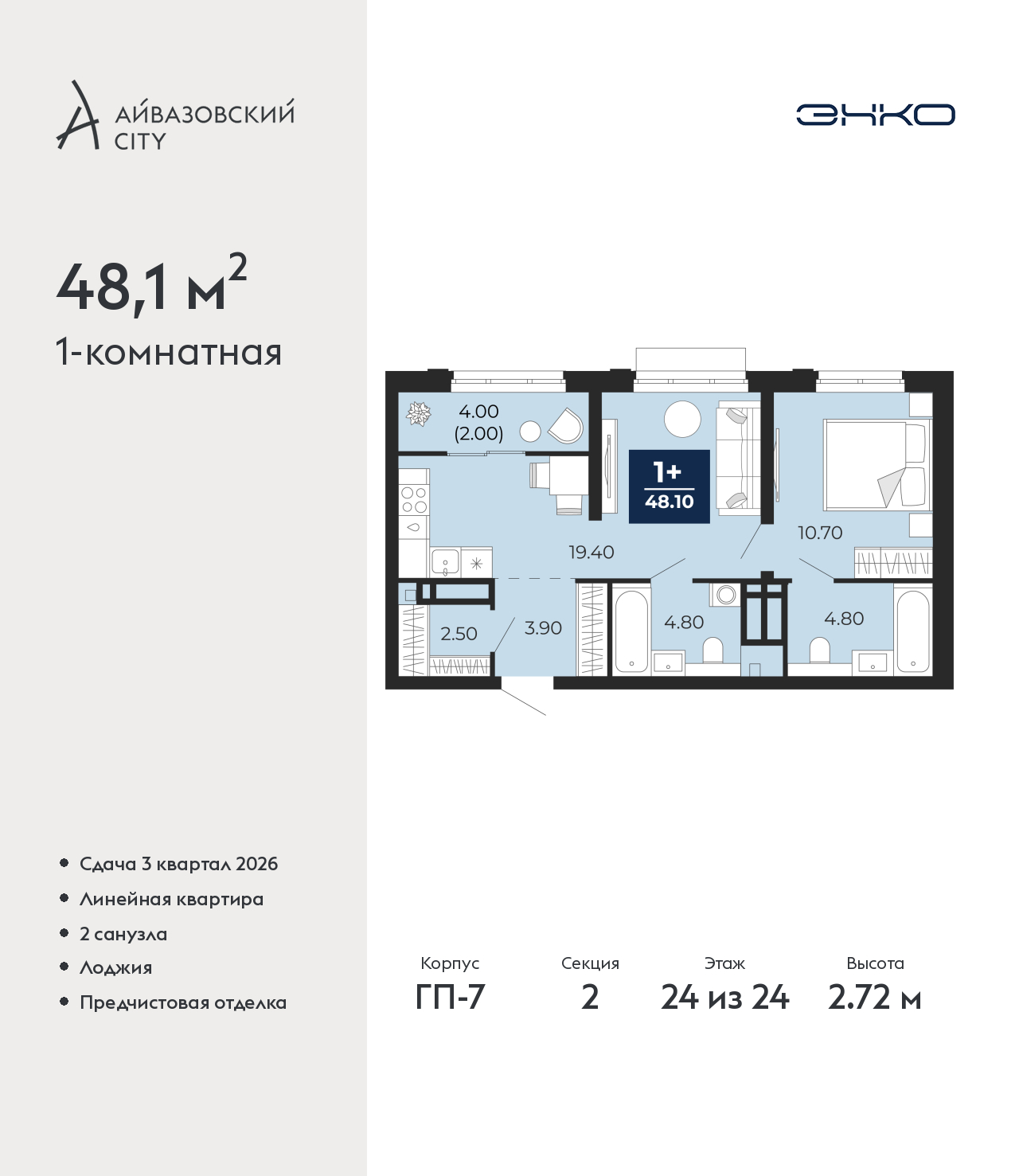 Продается однокомнатная квартира от застройщика с предчистовой отделкой в ЖК "Айвазовский City" на 24 этаже. Общая площадь: 48.1 кв.м., жилая: 10.7 кв.м., площадь просторной кухни-столовой: 19.4 кв.м. Все окна выходят на одну сторону. В квартире одна лоджия, два совмещенных санузла. Высота потолков 2.72 м. Дом монолитный, многоподъездный, переменной этажности, от 9 до 24 этажей. Квартира находится во 2-й секции высотой 24 этажа в корпусе ГП-7. На этаже 7 квартир. В подъезде 1 пассажирский и 2 грузовых лифта. Окончание строительства - 3 квартал 2026 года. Оформление сделки по договору долевого участия. Новый жилой район располагается в живописном месте на берегу Туры в центральной части города. Принципиально новое пространство для жизни в центре современного города для тех, чьи мечты сбываются, кто нацелен на постоянный рост, перемены к лучшему для себя и своих близких. Каждая деталь Айвазовский City вдохновляет и заряжает на новые свершения: авторская архитектура, сбалансированная продуманная инфраструктура, дизайнерские дворы со спортивными и детскими площадками, парковые зоны с фонтанами, водный канал, украшающий центральный прогулочный маршрут района и многое другое. В 2019 года проект стал лауреатом престижной премии Urban Awards 2019 в номинации «Лучший строящийся региональный жилой комплекс бизнес-класса». Главная особенность Айвазовский City - соседство разных архитектурных школ в рамках одного дома. Изысканная классика, выразительная эклектика и оригинальный модерн - жить в одном из таких домов настоящий повод для гордости. Айвазовский City это идеальное сочетание комфорта, технологий и развитой инфраструктуры. Вход в подъезд возможен с улицы и со двора. Отправляясь на работу или за покупками, жители могут выйти с внешней стороны дома, а для прогулки с ребенком – со стороны двора. Экологически чистые материалы и энергосберегающие технологии, качественное освещение общественных зон, видеонаблюдение по всей территории жилого района (в том числе в подъездах, лифтах и в подземном паркинге), закрытые дворы с доступом только для жителей Айвазовский City. Часть домов в Айвазовский City будут оснащены подземным паркингом. Востребованный в нашем климатическом поясе формат хранения автомобилей защитит собственность владельца в любое время года. Аккредитация в банках: ПАО Банк «ВТБ», «Сбербанк России», ОАО «Альфа-Банк», ПАО «Газпромбанк», ПАО Банк «ФК Открытие» и других. (AQID02483615)