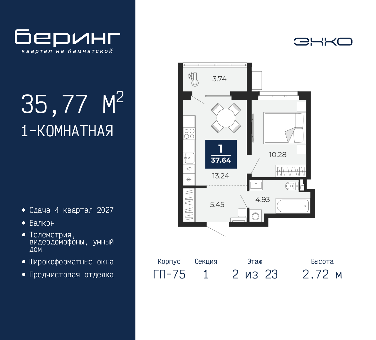 Продается 1-комн. квартира с предчистовой отделкой в ЖК "Беринг" на 2 этаже. Общая площадь: 35.77 кв.м., жилая: 10.28 кв.м., площадь просторной кухни-столовой: 13.24 кв.м. Все окна выходят на одну сторону. В квартире один балкон, один совмещенный санузел. Высота потолков 2.72 м. Дом монолитный, многоподъездный, переменной этажности, от 17 до 24 этажей. Квартира находится в 1-й секции высотой 23 этажа в корпусе ГП-75. На этаже 8 квартир. В подъезде 2 пассажирских и 1 грузовой лифт. Окончание строительства - 4 квартал 2027 года. Оформление сделки по договору долевого участия. Подобно знаменитому исследователю, мы чувствуем себя первооткрывателями этой локации. Хотим показать новую суть места, сформировать для вас жизненный опыт, которого ещё не было. Беринг — район зелёного цвета. Беринг — район, который откроется вам с другой стороны. Впечатлит новым уровнем комфорта и качеством жизни. Беринг — открытие на карте города. Первый квартал расположен в районе Тура, в границах улиц: Камчатская – Западносибирская – Энтузиастов. Вокруг уже есть всё для того, чтобы ежедневная рутина была лишь частью жизни и не доставляла дискомфорта. Школы и детские сады, магазины и аптеки, поликлиника, места для семейного отдыха, пеших и велопрогулок, и даже рыбалки. Масштабное озеленение дворов — визитная карточка ЭНКО и ваш оазис спокойствия, чтобы отвлечься от повседневности. Раскидистые деревья, кустарники, травы и цветы — осталось остановиться, вдохнуть и расслабиться, глядя на эту природную красоту. Стилистика подъездов продолжает концепцию Беринга, вдохновлённого Камчаткой: сдержанный, но при этом впечатляющий дизайн соседствует с удобством и функциональностью. (AQID02529542)