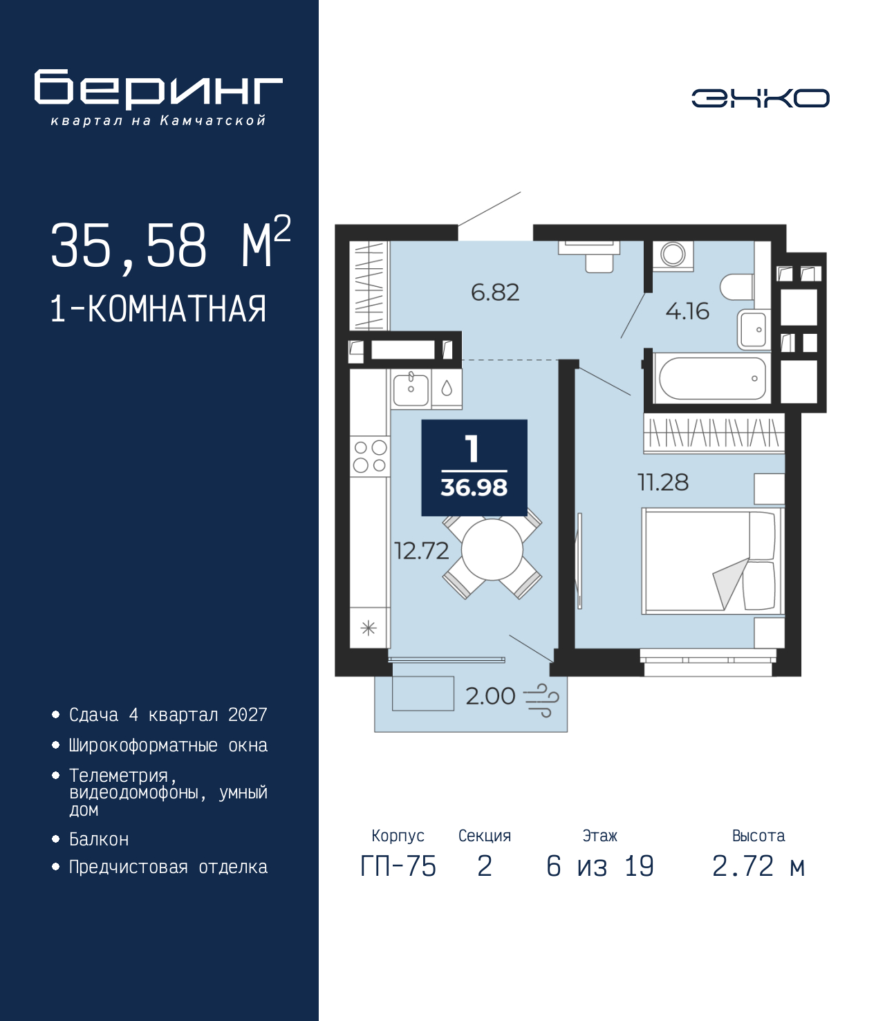 1-комн. квартира от застройщика с предчистовой отделкой в ЖК "Беринг" на 6 этаже. Общая площадь: 35.58 кв.м., жилая: 11.28 кв.м., площадь просторной кухни-столовой: 12.72 кв.м. Все окна выходят на одну сторону. В квартире один балкон, один совмещенный санузел. Высота потолков 2.72 м. Дом монолитный, многоподъездный, переменной этажности, от 17 до 24 этажей. Квартира находится во 2-й секции высотой 19 этажей в корпусе ГП-75. На этаже 7 квартир. В подъезде 2 пассажирских и 1 грузовой лифт. Окончание строительства - 4 квартал 2027 года. Оформление сделки по договору долевого участия. Подобно знаменитому исследователю, мы чувствуем себя первооткрывателями этой локации. Хотим показать новую суть места, сформировать для вас жизненный опыт, которого ещё не было. Беринг — район зелёного цвета. Беринг — район, который откроется вам с другой стороны. Впечатлит новым уровнем комфорта и качеством жизни. Беринг — открытие на карте города. Первый квартал расположен в районе Тура, в границах улиц: Камчатская – Западносибирская – Энтузиастов. Вокруг уже есть всё для того, чтобы ежедневная рутина была лишь частью жизни и не доставляла дискомфорта. Школы и детские сады, магазины и аптеки, поликлиника, места для семейного отдыха, пеших и велопрогулок, и даже рыбалки. Масштабное озеленение дворов — визитная карточка ЭНКО и ваш оазис спокойствия, чтобы отвлечься от повседневности. Раскидистые деревья, кустарники, травы и цветы — осталось остановиться, вдохнуть и расслабиться, глядя на эту природную красоту. Стилистика подъездов продолжает концепцию Беринга, вдохновлённого Камчаткой: сдержанный, но при этом впечатляющий дизайн соседствует с удобством и функциональностью. (AQID02529549)