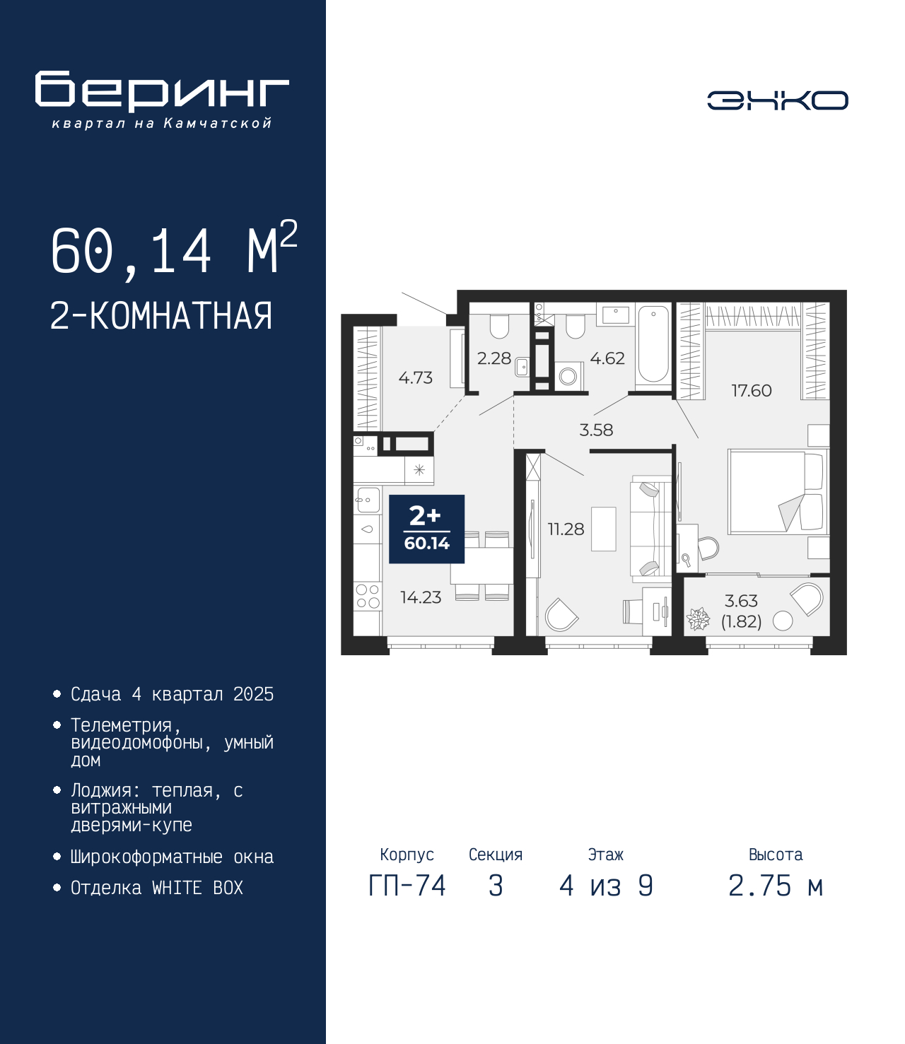 - Общая площадь 60.14 м²