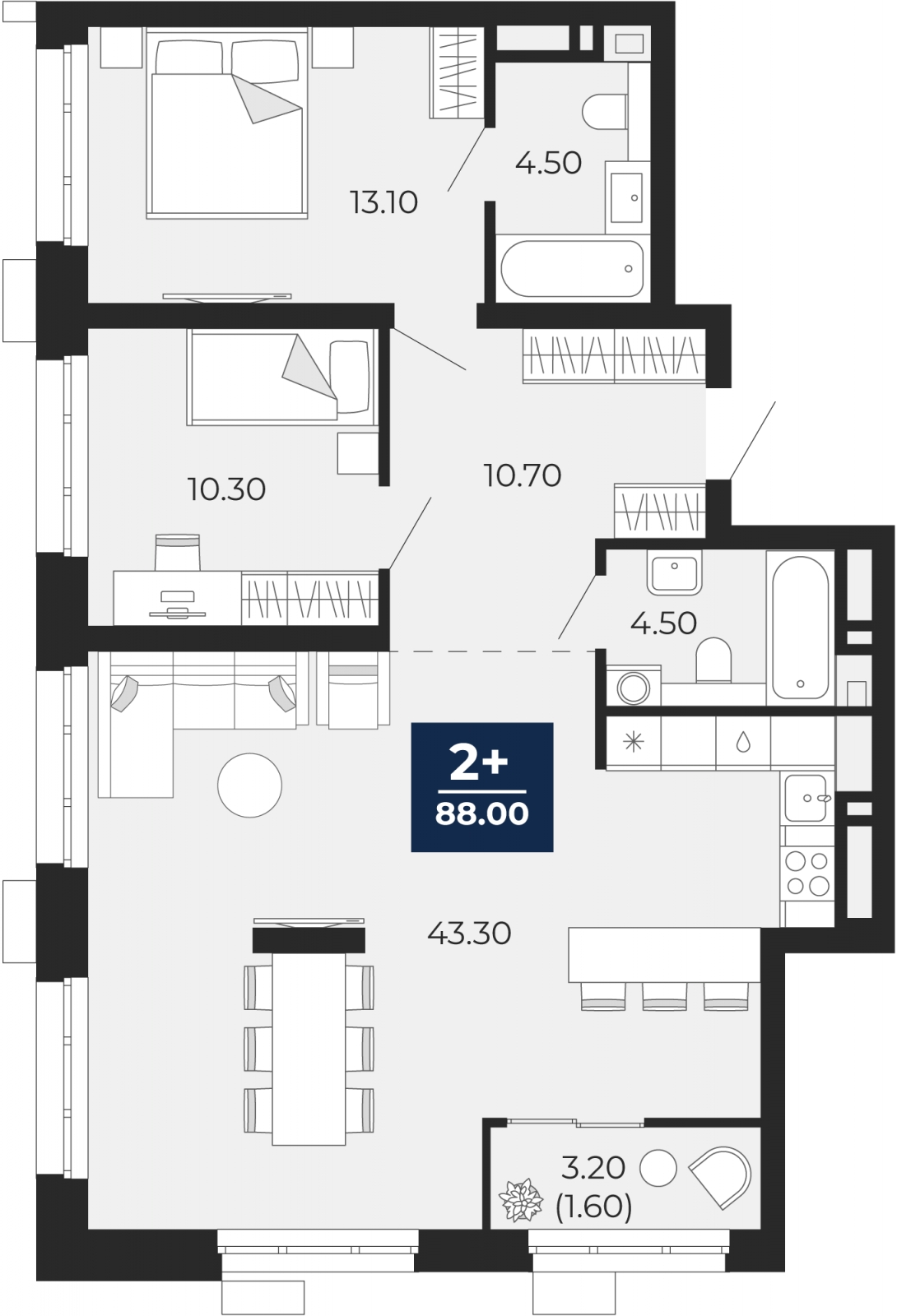 2-комн. квартира от застройщика с предчистовой отделкой в ЖК "Айвазовский City" на 7 этаже. Общая площадь: 88 кв.м., жилая: 23.4 кв.м., площадь просторной кухни-столовой: 43.3 кв.м. Угловая квартира, очень светлая, естественная вентиляция при открытии окон. В квартире одна лоджия, два совмещенных санузла. Высота потолков 2.72 м. Дом монолитный, многоподъездный, переменной этажности, от 9 до 24 этажей. Квартира находится во 2-й секции высотой 24 этажа в корпусе ГП-7. На этаже 7 квартир. В подъезде 1 пассажирский и 2 грузовых лифта. Окончание строительства - 3 квартал 2026 года. Оформление сделки по договору долевого участия. Новый жилой район располагается в живописном месте на берегу Туры в центральной части города. Принципиально новое пространство для жизни в центре современного города для тех, чьи мечты сбываются, кто нацелен на постоянный рост, перемены к лучшему для себя и своих близких. Каждая деталь Айвазовский City вдохновляет и заряжает на новые свершения: авторская архитектура, сбалансированная продуманная инфраструктура, дизайнерские дворы со спортивными и детскими площадками, парковые зоны с фонтанами, водный канал, украшающий центральный прогулочный маршрут района и многое другое. В 2019 года проект стал лауреатом престижной премии Urban Awards 2019 в номинации «Лучший строящийся региональный жилой комплекс бизнес-класса». Главная особенность Айвазовский City - соседство разных архитектурных школ в рамках одного дома. Изысканная классика, выразительная эклектика и оригинальный модерн - жить в одном из таких домов настоящий повод для гордости. Айвазовский City это идеальное сочетание комфорта, технологий и развитой инфраструктуры. Вход в подъезд возможен с улицы и со двора. Отправляясь на работу или за покупками, жители могут выйти с внешней стороны дома, а для прогулки с ребенком – со стороны двора. Экологически чистые материалы и энергосберегающие технологии, качественное освещение общественных зон, видеонаблюдение по всей территории жилого района (в том числе в подъездах, лифтах и в подземном паркинге), закрытые дворы с доступом только для жителей Айвазовский City. Часть домов в Айвазовский City будут оснащены подземным паркингом. Востребованный в нашем климатическом поясе формат хранения автомобилей защитит собственность владельца в любое время года. Аккредитация в банках: ПАО Банк «ВТБ», «Сбербанк России», ОАО «Альфа-Банк», ПАО «Газпромбанк», ПАО Банк «ФК Открытие» и других. (AQID02483574)
