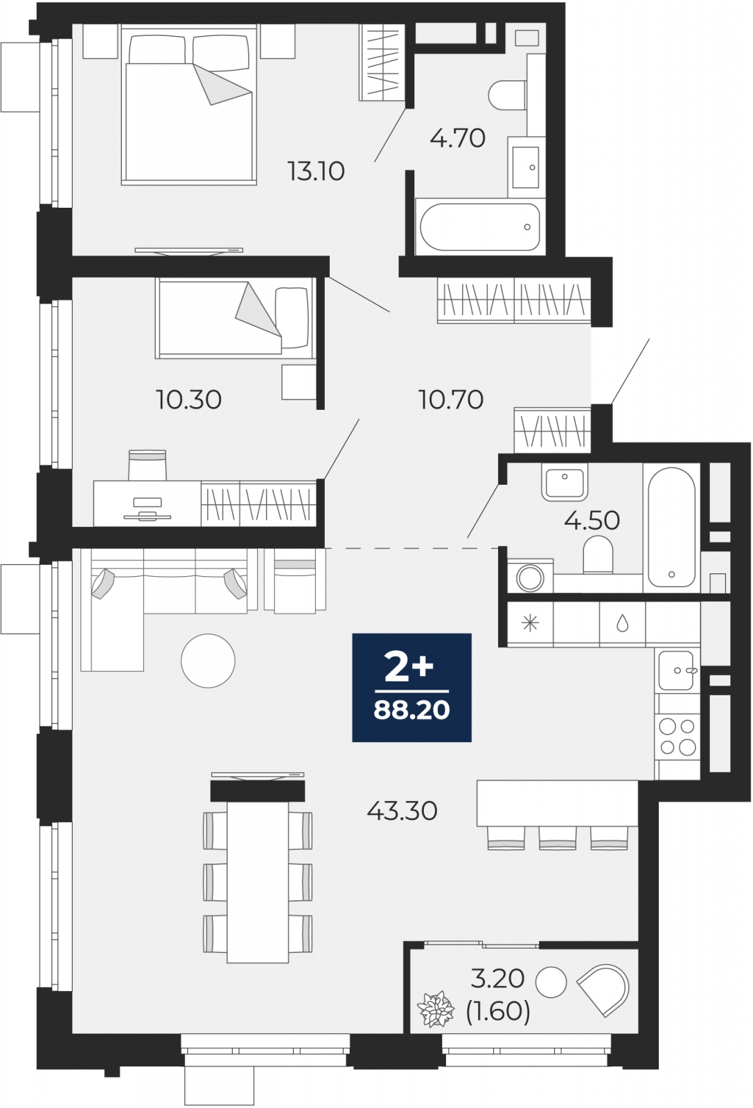 13 604 858 руб. 154 250 руб./м² Квартира 2-комн., 88 м2, 4/24 этаж, Пожарных и спасателей, д. 1