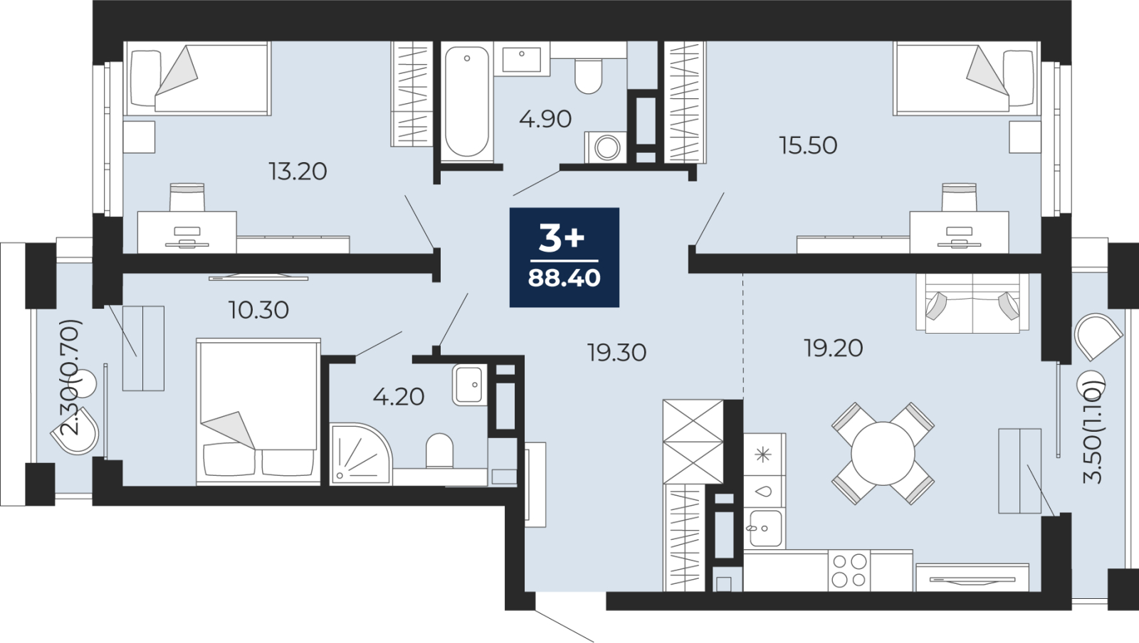 3-комн. квартира с предчистовой отделкой в ЖК "Айвазовский City" на 17 этаже. Общая площадь: 88.4 кв.м., жилая: 39 кв.м., площадь просторной кухни-столовой: 19.2 кв.м. Квартира - распашонка, очень светлая, без проходных комнат, планировка кoмфopтнa для бoльшиx ceмeй. В квартире два балкона, два совмещенных санузла. Высота потолков 2.7 м. Дом монолитный, многоподъездный, переменной этажности, от 14 до 24 этажей. Квартира находится в 4-й секции высотой 18 этажей в корпусе ГП-8. На этаже 6 квартир. В подъезде 1 пассажирский и 1 грузовой лифт. Окончание строительства - 3 квартал 2026 года. Оформление сделки по договору долевого участия. Новый жилой район располагается в живописном месте на берегу Туры в центральной части города. Принципиально новое пространство для жизни в центре современного города для тех, чьи мечты сбываются, кто нацелен на постоянный рост, перемены к лучшему для себя и своих близких. Каждая деталь Айвазовский City вдохновляет и заряжает на новые свершения: авторская архитектура, сбалансированная продуманная инфраструктура, дизайнерские дворы со спортивными и детскими площадками, парковые зоны с фонтанами, водный канал, украшающий центральный прогулочный маршрут района и многое другое. В 2019 года проект стал лауреатом престижной премии Urban Awards 2019 в номинации «Лучший строящийся региональный жилой комплекс бизнес-класса». Главная особенность Айвазовский City - соседство разных архитектурных школ в рамках одного дома. Изысканная классика, выразительная эклектика и оригинальный модерн - жить в одном из таких домов настоящий повод для гордости. Айвазовский City это идеальное сочетание комфорта, технологий и развитой инфраструктуры. Вход в подъезд возможен с улицы и со двора. Отправляясь на работу или за покупками, жители могут выйти с внешней стороны дома, а для прогулки с ребенком – со стороны двора. Экологически чистые материалы и энергосберегающие технологии, качественное освещение общественных зон, видеонаблюдение по всей территории жилого района (в том числе в подъездах, лифтах и в подземном паркинге), закрытые дворы с доступом только для жителей Айвазовский City. Часть домов в Айвазовский City будут оснащены подземным паркингом. Востребованный в нашем климатическом поясе формат хранения автомобилей защитит собственность владельца в любое время года. Аккредитация в банках: ОАО «Альфа-Банк», ПАО «Газпромбанк», ПАО Банк «ВТБ», «Сбербанк России», ПАО «Промсвязьбанк» и других. (AQID02488033)