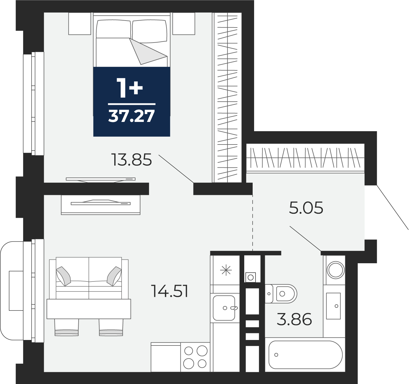 - Жилая площадь 13.85 м²