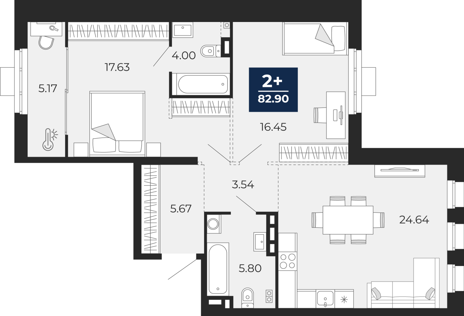 Квартира 2-комн., 83 м2, 2/24 этаж,