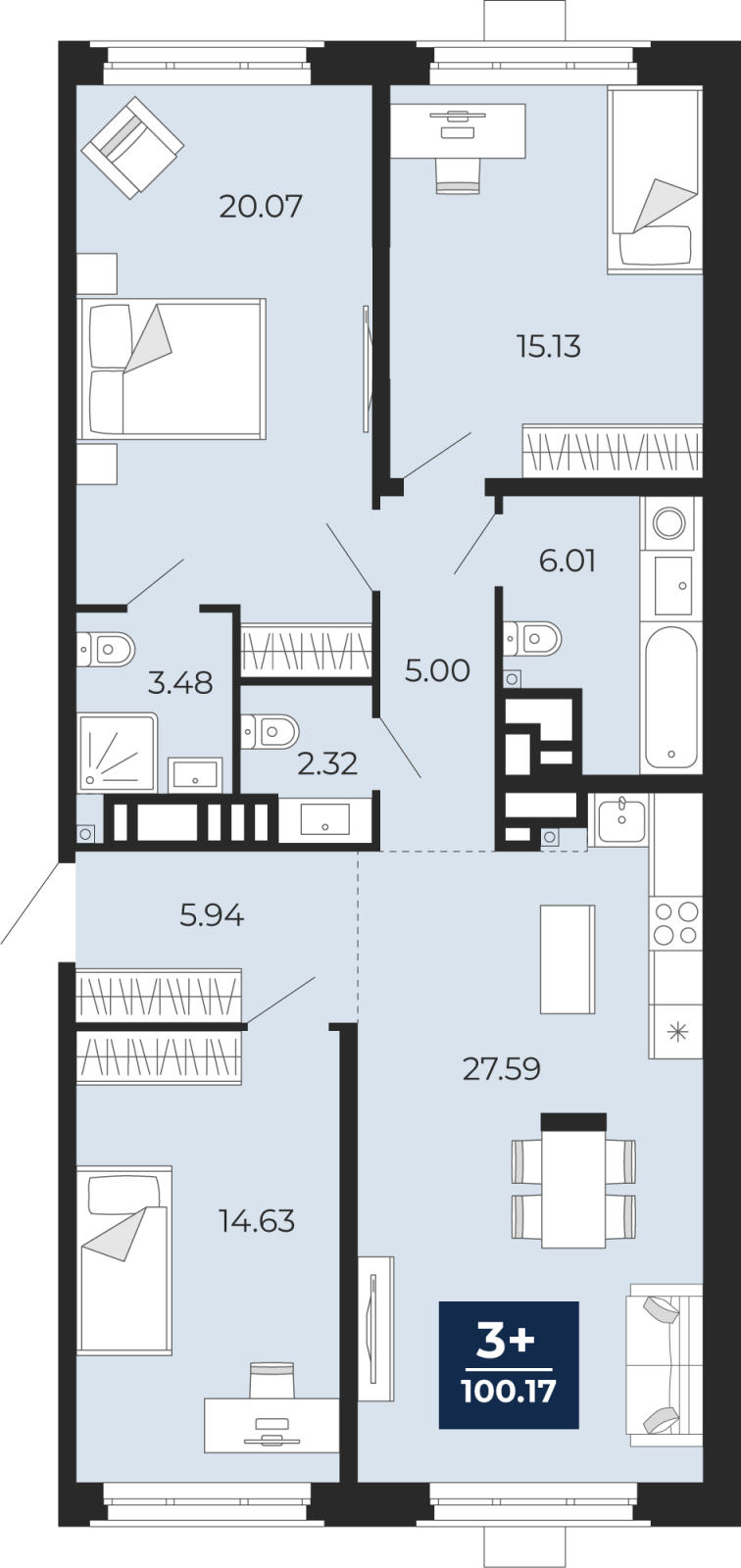 Просторная 3-комн. квартира с предчистовой отделкой в ЖК "Айвазовский City" на 18 этаже. Общая площадь: 100.17 кв.м., жилая: 49.83 кв.м., площадь просторной кухни-столовой: 27.59 кв.м. Квартира - распашонка, без проходных комнат, окна выходят на paзные стороны дома. В квартире два совмещенных и один раздельный санузел. Высота потолков 2.7 м. Дом монолитный, многоподъездный, высотой 24 этажа. Квартира находится в 3-й секции в корпусе ГП-12. На этаже 6 квартир. В подъезде 1 пассажирский и 1 грузовой лифт. Окончание строительства - 4 квартал 2028 года. Оформление сделки по договору долевого участия. Новый жилой район располагается в живописном месте на берегу Туры в центральной части города. Принципиально новое пространство для жизни в центре современного города для тех, чьи мечты сбываются, кто нацелен на постоянный рост, перемены к лучшему для себя и своих близких. Каждая деталь Айвазовский City вдохновляет и заряжает на новые свершения: авторская архитектура, сбалансированная продуманная инфраструктура, дизайнерские дворы со спортивными и детскими площадками, парковые зоны с фонтанами, водный канал, украшающий центральный прогулочный маршрут района и многое другое. В 2019 года проект стал лауреатом престижной премии Urban Awards 2019 в номинации «Лучший строящийся региональный жилой комплекс бизнес-класса». Главная особенность Айвазовский City - соседство разных архитектурных школ в рамках одного дома. Изысканная классика, выразительная эклектика и оригинальный модерн - жить в одном из таких домов настоящий повод для гордости. Айвазовский City это идеальное сочетание комфорта, технологий и развитой инфраструктуры. Вход в подъезд возможен с улицы и со двора. Отправляясь на работу или за покупками, жители могут выйти с внешней стороны дома, а для прогулки с ребенком – со стороны двора. Экологически чистые материалы и энергосберегающие технологии, качественное освещение общественных зон, видеонаблюдение по всей территории жилого района (в том числе в подъездах, лифтах и в подземном паркинге), закрытые дворы с доступом только для жителей Айвазовский City. Часть домов в Айвазовский City будут оснащены подземным паркингом. Востребованный в нашем климатическом поясе формат хранения автомобилей защитит собственность владельца в любое время года. Аккредитация в банках: ПАО «Газпромбанк», ПАО Банк «ВТБ», ОАО «Альфа-Банк», «Сбербанк России», ПАО Банк «ФК Открытие» и других. (AQID02525777)