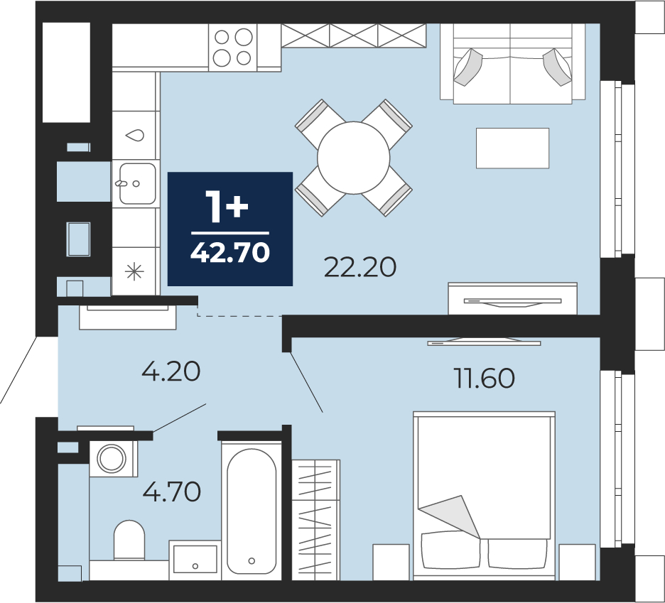 - Общая площадь 42.7 м²
