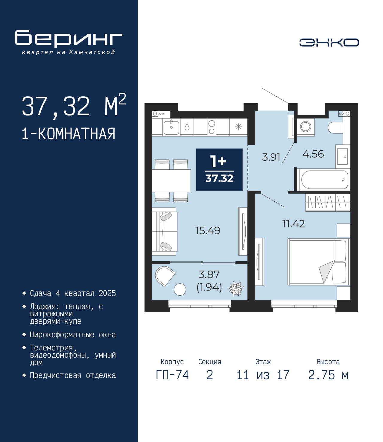 Просторная однокомнатная квартира с предчистовой отделкой в ЖК "Беринг" на 11 этаже. Общая площадь: 37.32 кв.м., жилая: 11.42 кв.м., площадь просторной кухни-столовой: 15.49 кв.м. Все окна выходят на одну сторону. В квартире одна лоджия, один совмещенный санузел. Высота потолков 2.75 м. Дом монолитный, многоподъездный, переменной этажности, от 9 до 21 этажей. Квартира находится во 2-й секции высотой 17 этажей в корпусе ГП-74. На этаже 7 квартир. В подъезде 1 пассажирский и 1 грузовой лифт. Окончание строительства - 4 квартал 2025 года. Оформление сделки по договору долевого участия. Подобно знаменитому исследователю, мы чувствуем себя первооткрывателями этой локации. Хотим показать новую суть места, сформировать для вас жизненный опыт, которого ещё не было. Беринг — район зелёного цвета. Беринг — район, который откроется вам с другой стороны. Впечатлит новым уровнем комфорта и качеством жизни. Беринг — открытие на карте города. Первый квартал расположен в районе Тура, в границах улиц: Камчатская – Западносибирская – Энтузиастов. Вокруг уже есть всё для того, чтобы ежедневная рутина была лишь частью жизни и не доставляла дискомфорта. Школы и детские сады, магазины и аптеки, поликлиника, места для семейного отдыха, пеших и велопрогулок, и даже рыбалки. Масштабное озеленение дворов — визитная карточка ЭНКО и ваш оазис спокойствия, чтобы отвлечься от повседневности. Раскидистые деревья, кустарники, травы и цветы — осталось остановиться, вдохнуть и расслабиться, глядя на эту природную красоту. Стилистика подъездов продолжает концепцию Беринга, вдохновлённого Камчаткой: сдержанный, но при этом впечатляющий дизайн соседствует с удобством и функциональностью. (AQID02527842)