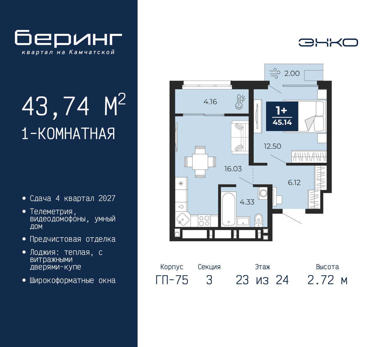 Продается 1-комн. квартира от застройщика с предчистовой отделкой в ЖК "Беринг" на 23 этаже. Общая площадь: 43.74 кв.м., жилая: 12.5 кв.м., площадь просторной кухни-столовой: 16.03 кв.м. Все окна выходят на одну сторону. В квартире один балкон и одна лоджия, один совмещенный санузел. Высота потолков 2.72 м. Дом монолитный, многоподъездный, переменной этажности, от 17 до 24 этажей. Квартира находится в 3-й секции высотой 24 этажа в корпусе ГП-75. На этаже 6 квартир. В подъезде 2 пассажирских и 1 грузовой лифт. Окончание строительства - 4 квартал 2027 года. Оформление сделки по договору долевого участия. Подобно знаменитому исследователю, мы чувствуем себя первооткрывателями этой локации. Хотим показать новую суть места, сформировать для вас жизненный опыт, которого ещё не было. Беринг — район зелёного цвета. Беринг — район, который откроется вам с другой стороны. Впечатлит новым уровнем комфорта и качеством жизни. Беринг — открытие на карте города. Первый квартал расположен в районе Тура, в границах улиц: Камчатская – Западносибирская – Энтузиастов. Вокруг уже есть всё для того, чтобы ежедневная рутина была лишь частью жизни и не доставляла дискомфорта. Школы и детские сады, магазины и аптеки, поликлиника, места для семейного отдыха, пеших и велопрогулок, и даже рыбалки. Масштабное озеленение дворов — визитная карточка ЭНКО и ваш оазис спокойствия, чтобы отвлечься от повседневности. Раскидистые деревья, кустарники, травы и цветы — осталось остановиться, вдохнуть и расслабиться, глядя на эту природную красоту. Стилистика подъездов продолжает концепцию Беринга, вдохновлённого Камчаткой: сдержанный, но при этом впечатляющий дизайн соседствует с удобством и функциональностью. (AQID02529641)