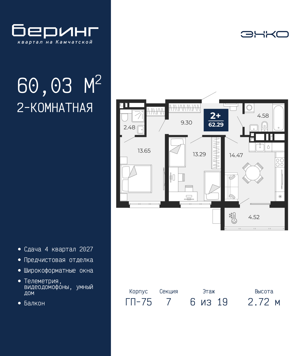 Просторная 2-комн. квартира с предчистовой отделкой в ЖК "Беринг" на 6 этаже. Общая площадь: 60.03 кв.м., жилая: 26.94 кв.м., площадь просторной кухни-столовой: 14.47 кв.м. Комнаты изолированные, все окна выходят на одну сторону. В квартире один балкон, два совмещенных санузла. Высота потолков 2.72 м. Дом монолитный, многоподъездный, переменной этажности, от 17 до 24 этажей. Квартира находится в 7-й секции высотой 19 этажей в корпусе ГП-75. На этаже 7 квартир. В подъезде 2 пассажирских и 1 грузовой лифт. Окончание строительства - 4 квартал 2027 года. Оформление сделки по договору долевого участия. Подобно знаменитому исследователю, мы чувствуем себя первооткрывателями этой локации. Хотим показать новую суть места, сформировать для вас жизненный опыт, которого ещё не было. Беринг — район зелёного цвета. Беринг — район, который откроется вам с другой стороны. Впечатлит новым уровнем комфорта и качеством жизни. Беринг — открытие на карте города. Первый квартал расположен в районе Тура, в границах улиц: Камчатская – Западносибирская – Энтузиастов. Вокруг уже есть всё для того, чтобы ежедневная рутина была лишь частью жизни и не доставляла дискомфорта. Школы и детские сады, магазины и аптеки, поликлиника, места для семейного отдыха, пеших и велопрогулок, и даже рыбалки. Масштабное озеленение дворов — визитная карточка ЭНКО и ваш оазис спокойствия, чтобы отвлечься от повседневности. Раскидистые деревья, кустарники, травы и цветы — осталось остановиться, вдохнуть и расслабиться, глядя на эту природную красоту. Стилистика подъездов продолжает концепцию Беринга, вдохновлённого Камчаткой: сдержанный, но при этом впечатляющий дизайн соседствует с удобством и функциональностью. (AQID02529718)