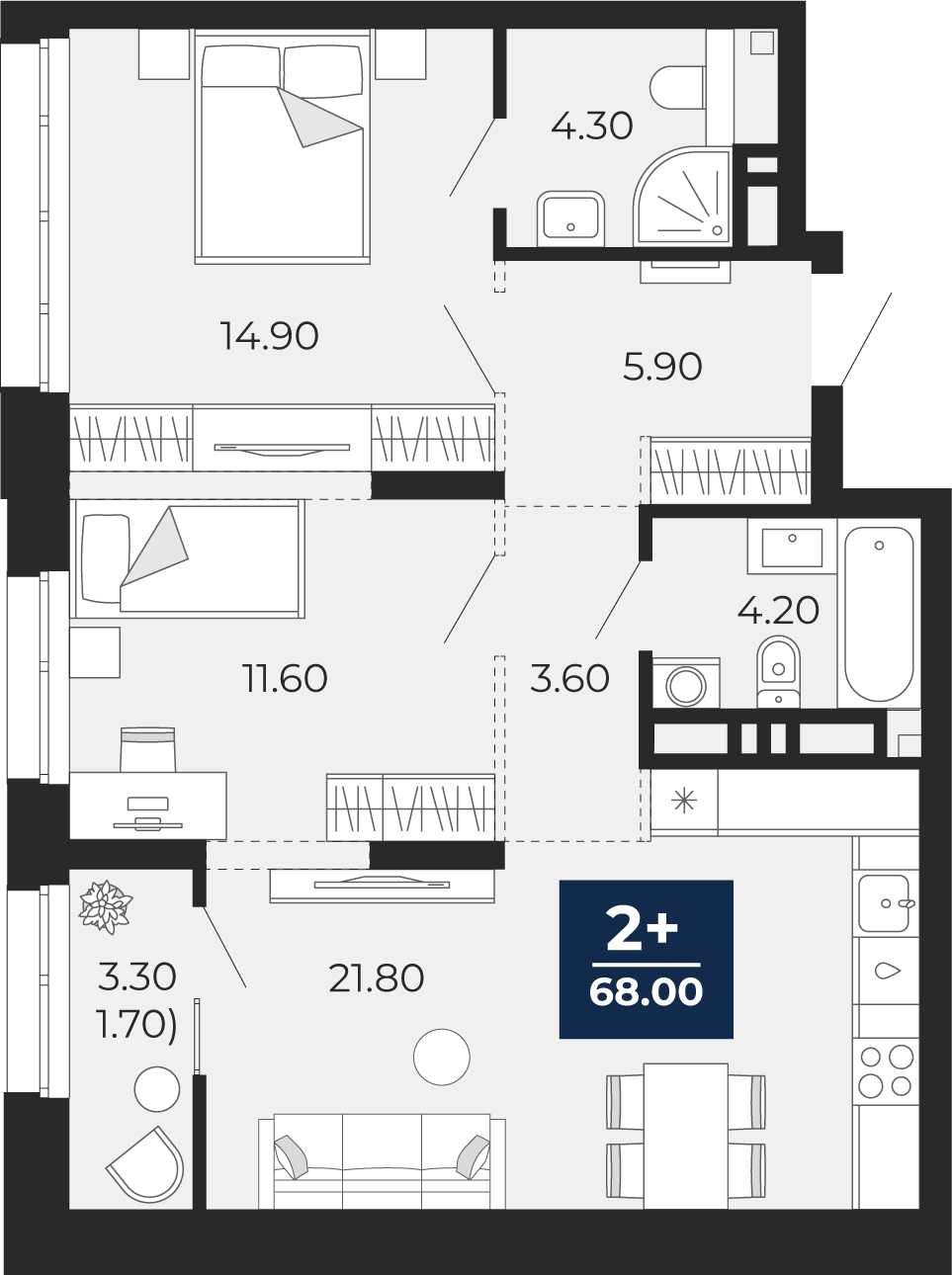 2-комн. квартира от застройщика с предчистовой отделкой в ЖК "Айвазовский City" на 4 этаже. Общая площадь: 68 кв.м., жилая: 26.5 кв.м., площадь просторной кухни-столовой: 21.8 кв.м. Комнаты изолированные, все окна выходят на одну сторону. В квартире одна лоджия, два совмещенных санузла. Высота потолков 2.7 м. Дом монолитный, многоподъездный, переменной этажности, от 14 до 24 этажей. Квартира находится во 2-й секции высотой 18 этажей в корпусе ГП-8. На этаже 5 квартир. В подъезде 1 пассажирский и 1 грузовой лифт. Окончание строительства - 3 квартал 2026 года. Оформление сделки по договору долевого участия. Новый жилой район располагается в живописном месте на берегу Туры в центральной части города. Принципиально новое пространство для жизни в центре современного города для тех, чьи мечты сбываются, кто нацелен на постоянный рост, перемены к лучшему для себя и своих близких. Каждая деталь Айвазовский City вдохновляет и заряжает на новые свершения: авторская архитектура, сбалансированная продуманная инфраструктура, дизайнерские дворы со спортивными и детскими площадками, парковые зоны с фонтанами, водный канал, украшающий центральный прогулочный маршрут района и многое другое. В 2019 года проект стал лауреатом престижной премии Urban Awards 2019 в номинации «Лучший строящийся региональный жилой комплекс бизнес-класса». Главная особенность Айвазовский City - соседство разных архитектурных школ в рамках одного дома. Изысканная классика, выразительная эклектика и оригинальный модерн - жить в одном из таких домов настоящий повод для гордости. Айвазовский City это идеальное сочетание комфорта, технологий и развитой инфраструктуры. Вход в подъезд возможен с улицы и со двора. Отправляясь на работу или за покупками, жители могут выйти с внешней стороны дома, а для прогулки с ребенком – со стороны двора. Экологически чистые материалы и энергосберегающие технологии, качественное освещение общественных зон, видеонаблюдение по всей территории жилого района (в том числе в подъездах, лифтах и в подземном паркинге), закрытые дворы с доступом только для жителей Айвазовский City. Часть домов в Айвазовский City будут оснащены подземным паркингом. Востребованный в нашем климатическом поясе формат хранения автомобилей защитит собственность владельца в любое время года. Аккредитация в банках: ПАО Банк «ВТБ», «Сбербанк России», ОАО «Альфа-Банк», ПАО «Газпромбанк», ПАО «Промсвязьбанк» и других. (AQID02488006)