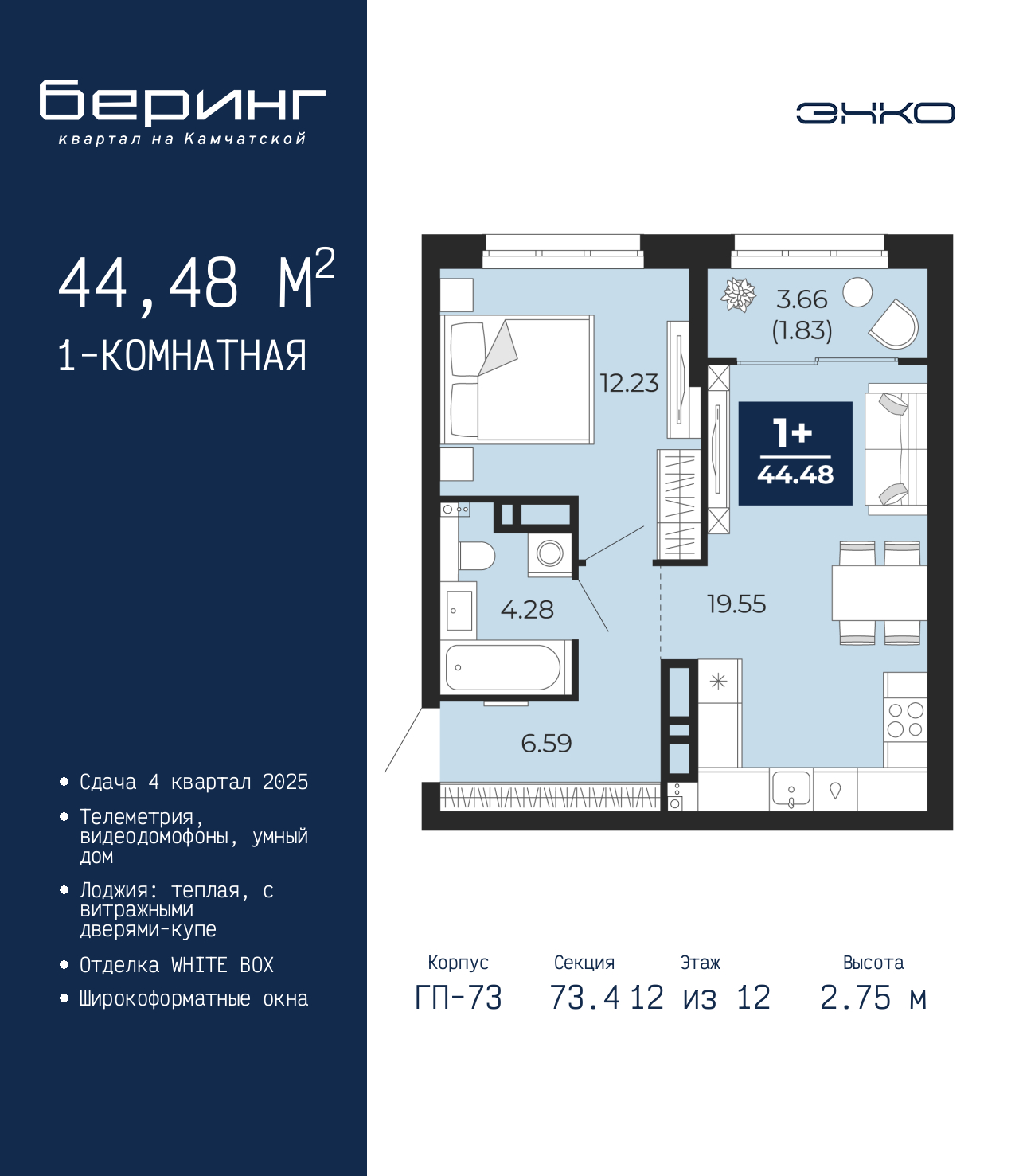 1-комн. квартира с предчистовой отделкой в ЖК "Беринг" на 12 этаже. Общая площадь: 44.48 кв.м., жилая: 12.23 кв.м., площадь просторной кухни-столовой: 19.55 кв.м. Все окна выходят на одну сторону. В квартире одна лоджия, один совмещенный санузел. Высота потолков 2.75 м. Дом монолитный, многоподъездный, переменной этажности, от 9 до 22 этажей. Квартира находится в 73.4-й секции высотой 12 этажей в корпусе ГП-73. На этаже 8 квартир. В подъезде 1 пассажирский и 1 грузовой лифт. Окончание строительства - 4 квартал 2025 года. Оформление сделки по договору долевого участия. Подобно знаменитому исследователю, мы чувствуем себя первооткрывателями этой локации. Хотим показать новую суть места, сформировать для вас жизненный опыт, которого ещё не было. Беринг — район зелёного цвета. Беринг — район, который откроется вам с другой стороны. Впечатлит новым уровнем комфорта и качеством жизни. Беринг — открытие на карте города. Первый квартал расположен в районе Тура, в границах улиц: Камчатская – Западносибирская – Энтузиастов. Вокруг уже есть всё для того, чтобы ежедневная рутина была лишь частью жизни и не доставляла дискомфорта. Школы и детские сады, магазины и аптеки, поликлиника, места для семейного отдыха, пеших и велопрогулок, и даже рыбалки. Масштабное озеленение дворов — визитная карточка ЭНКО и ваш оазис спокойствия, чтобы отвлечься от повседневности. Раскидистые деревья, кустарники, травы и цветы — осталось остановиться, вдохнуть и расслабиться, глядя на эту природную красоту. Стилистика подъездов продолжает концепцию Беринга, вдохновлённого Камчаткой: сдержанный, но при этом впечатляющий дизайн соседствует с удобством и функциональностью. (AQID02497855)