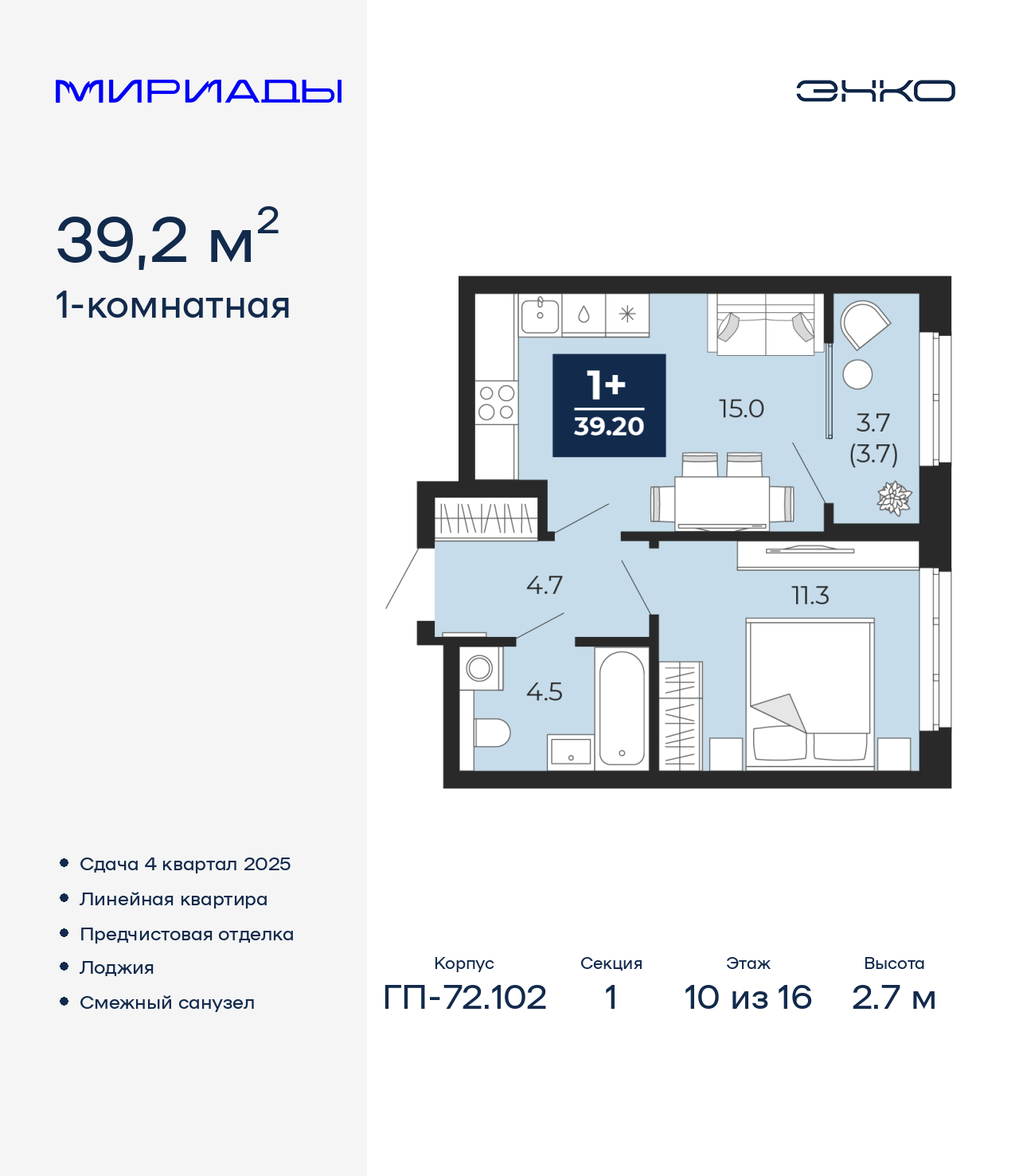Продается однокомнатная квартира от застройщика с предчистовой отделкой в ЖК "Мириады" на 10 этаже. Общая площадь: 39.2 кв.м., жилая: 11.3 кв.м., площадь просторной кухни-столовой: 15 кв.м. Все окна выходят на одну сторону. В квартире одна лоджия, один совмещенный санузел. Высота потолков 2.7 м. Дом монолитный, многоподъездный, переменной этажности, от 14 до 16 этажей. Квартира находится в 1-й секции высотой 16 этажей в корпусе ГП-72.102. На этаже 9 квартир. В подъезде 1 пассажирский и 1 грузовой лифт. Окончание строительства - 4 квартал 2025 года. Оформление сделки по договору долевого участия. Вселенная бесконечных историй. Ранее невиданный Тюмени масштаб: территория 240 гектаров и 1 650 000 м² застройки. Мириады – это город масштабных перемен и больших возможностей. Город зеленых рощ и зеркальных озер. Город для работы, учебы и развлечений. Город для детей и их родителей. Город для всех и каждого. Проект расположен в районе Мыс рядом с ТРЦ «Тюмень Сити Молл» в границах улицы Тимофея Чаркова, Тобольского тракта и объездной дороги. Срок полного освоения территории - до 2034 года. (AQID02536516)