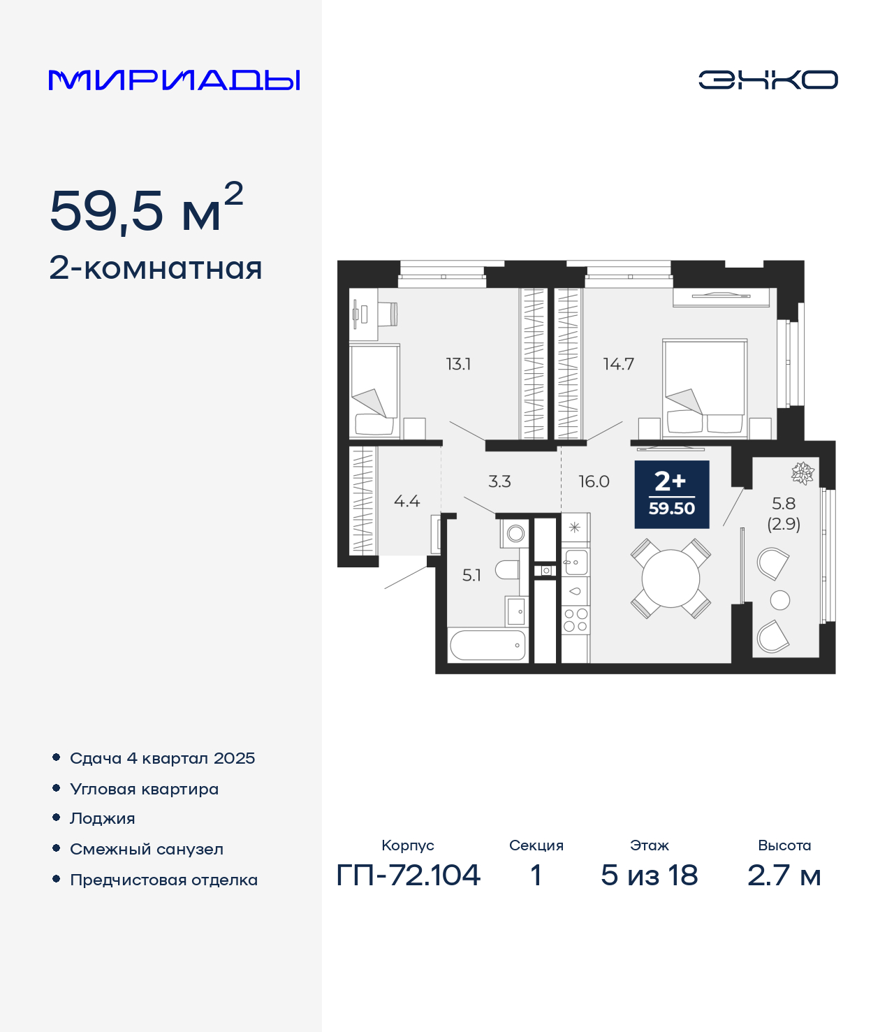 Двухкомнатная квартира от застройщика с предчистовой отделкой в ЖК "Мириады" на 5 этаже. Общая площадь: 59.5 кв.м., жилая: 27.8 кв.м., площадь просторной кухни-столовой: 16 кв.м. Угловая квартира, идеально подойдет любителям тишины и панорамных видов. В квартире одна лоджия, один совмещенный санузел. Высота потолков 2.7 м. Дом монолитный, двухподъездный, переменной этажности, от 14 до 18 этажей. Квартира находится в 1-й секции высотой 18 этажей в корпусе ГП-72.104. На этаже 6 квартир. В подъезде 1 пассажирский и 1 грузовой лифт. Окончание строительства - 4 квартал 2025 года. Оформление сделки по договору долевого участия. Вселенная бесконечных историй. Ранее невиданный Тюмени масштаб: территория 240 гектаров и 1 650 000 м² застройки. Мириады – это город масштабных перемен и больших возможностей. Город зеленых рощ и зеркальных озер. Город для работы, учебы и развлечений. Город для детей и их родителей. Город для всех и каждого. Проект расположен в районе Мыс рядом с ТРЦ «Тюмень Сити Молл» в границах улицы Тимофея Чаркова, Тобольского тракта и объездной дороги. Срок полного освоения территории - до 2034 года. (AQID02536607)