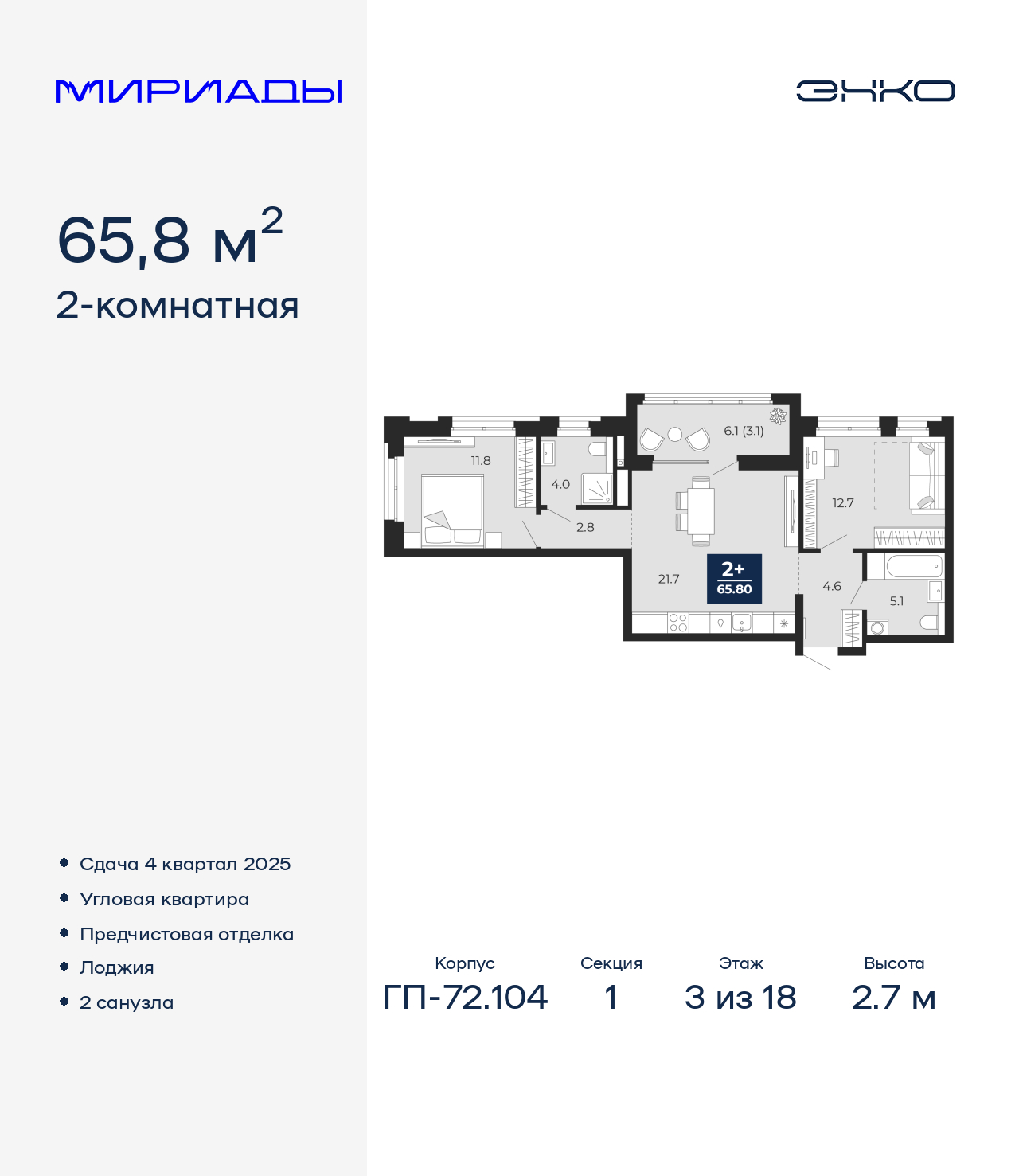 2-комн. квартира от застройщика с предчистовой отделкой в ЖК "Мириады" на 3 этаже. Общая площадь: 65.8 кв.м., жилая: 24.5 кв.м., площадь просторной кухни-столовой: 21.7 кв.м. Квартира угловая, очень светлая, естественная вентиляция при открытии окон. В квартире одна лоджия, два совмещенных санузла. Высота потолков 2.7 м. Дом монолитный, двухподъездный, переменной этажности, от 14 до 18 этажей. Квартира находится в 1-й секции высотой 18 этажей в корпусе ГП-72.104. На этаже 6 квартир. В подъезде 1 пассажирский и 1 грузовой лифт. Окончание строительства - 4 квартал 2025 года. Оформление сделки по договору долевого участия. Вселенная бесконечных историй. Ранее невиданный Тюмени масштаб: территория 240 гектаров и 1 650 000 м² застройки. Мириады – это город масштабных перемен и больших возможностей. Город зеленых рощ и зеркальных озер. Город для работы, учебы и развлечений. Город для детей и их родителей. Город для всех и каждого. Проект расположен в районе Мыс рядом с ТРЦ «Тюмень Сити Молл» в границах улицы Тимофея Чаркова, Тобольского тракта и объездной дороги. Срок полного освоения территории - до 2034 года. (AQID02536573)
