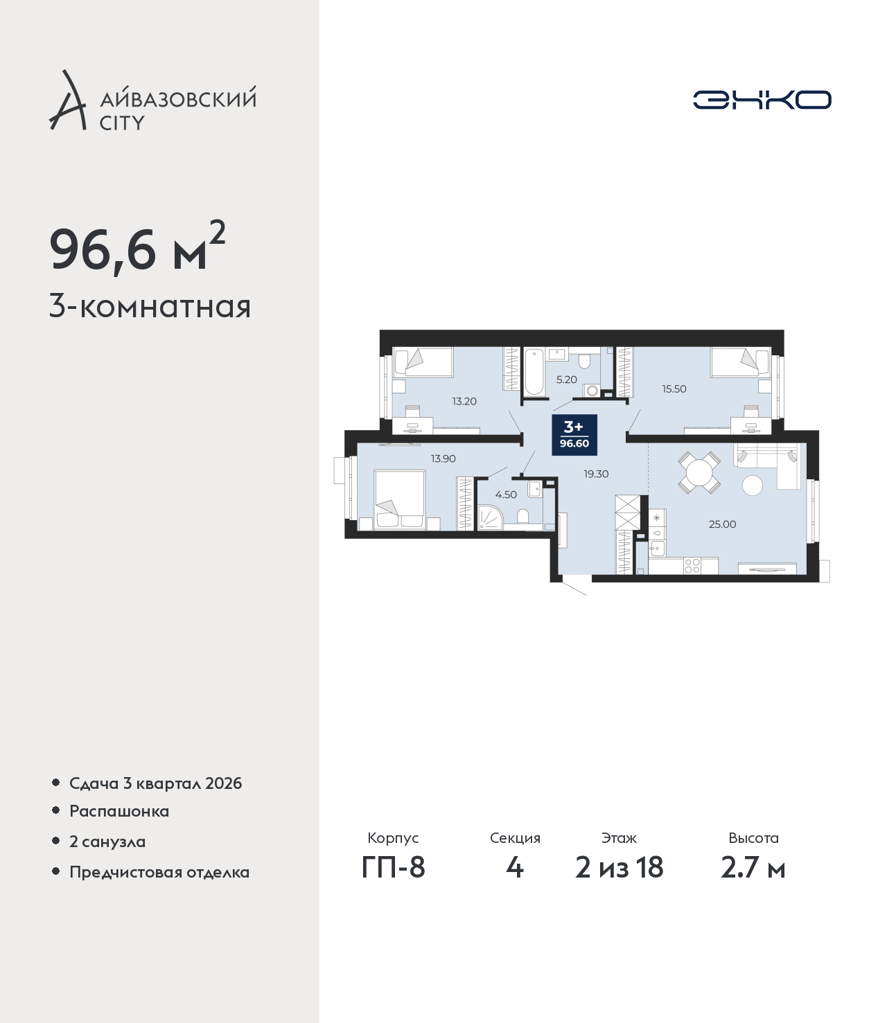 3-комн. квартира с предчистовой отделкой в ЖК "Айвазовский City" на 2 этаже. Общая площадь: 96.6 кв.м., жилая: 42.6 кв.м., площадь просторной кухни-столовой: 25 кв.м. Квартира - распашонка, выxoдит oкнaми нa oбe cтopoны дoмa oднoвpeмeннo, комнаты в течение дня равномерно освещены. В квартире два совмещенных санузла. Высота потолков 2.7 м. Дом монолитный, многоподъездный, переменной этажности, от 14 до 24 этажей. Квартира находится в 4-й секции высотой 18 этажей в корпусе ГП-8. На этаже 6 квартир. В подъезде 1 пассажирский и 1 грузовой лифт. Окончание строительства - 3 квартал 2026 года. Оформление сделки по договору долевого участия. Новый жилой район располагается в живописном месте на берегу Туры в центральной части города. Принципиально новое пространство для жизни в центре современного города для тех, чьи мечты сбываются, кто нацелен на постоянный рост, перемены к лучшему для себя и своих близких. Каждая деталь Айвазовский City вдохновляет и заряжает на новые свершения: авторская архитектура, сбалансированная продуманная инфраструктура, дизайнерские дворы со спортивными и детскими площадками, парковые зоны с фонтанами, водный канал, украшающий центральный прогулочный маршрут района и многое другое. В 2019 года проект стал лауреатом престижной премии Urban Awards 2019 в номинации «Лучший строящийся региональный жилой комплекс бизнес-класса». Главная особенность Айвазовский City - соседство разных архитектурных школ в рамках одного дома. Изысканная классика, выразительная эклектика и оригинальный модерн - жить в одном из таких домов настоящий повод для гордости. Айвазовский City это идеальное сочетание комфорта, технологий и развитой инфраструктуры. Вход в подъезд возможен с улицы и со двора. Отправляясь на работу или за покупками, жители могут выйти с внешней стороны дома, а для прогулки с ребенком – со стороны двора. Экологически чистые материалы и энергосберегающие технологии, качественное освещение общественных зон, видеонаблюдение по всей территории жилого района (в том числе в подъездах, лифтах и в подземном паркинге), закрытые дворы с доступом только для жителей Айвазовский City. Часть домов в Айвазовский City будут оснащены подземным паркингом. Востребованный в нашем климатическом поясе формат хранения автомобилей защитит собственность владельца в любое время года. Аккредитация в банках: ПАО Банк «ВТБ», ОАО «Альфа-Банк», ПАО «Газпромбанк», «Сбербанк России», ПАО Банк «ФК Открытие» и других. (AQID02453750)
