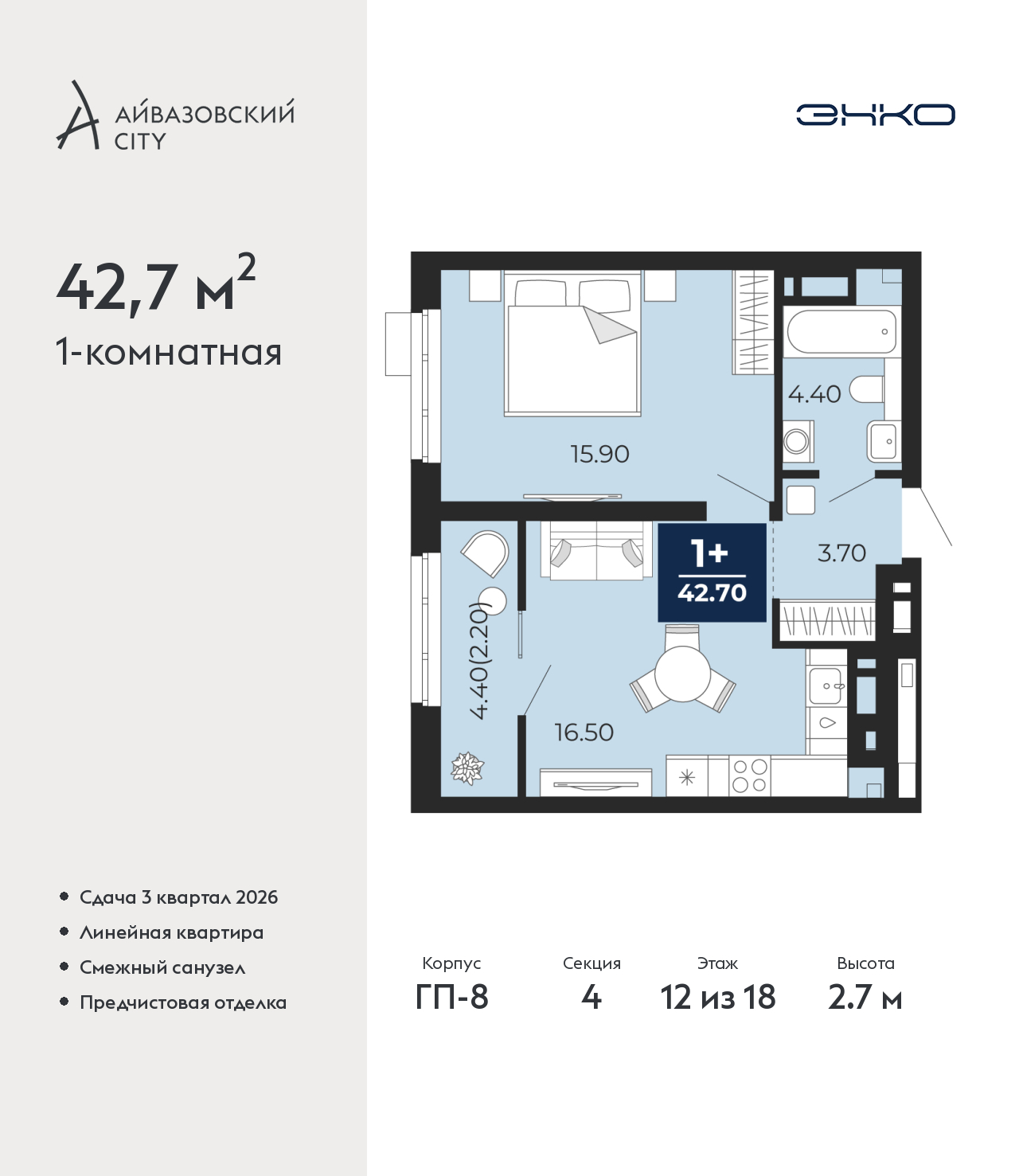 - Общая площадь 42.7 м²