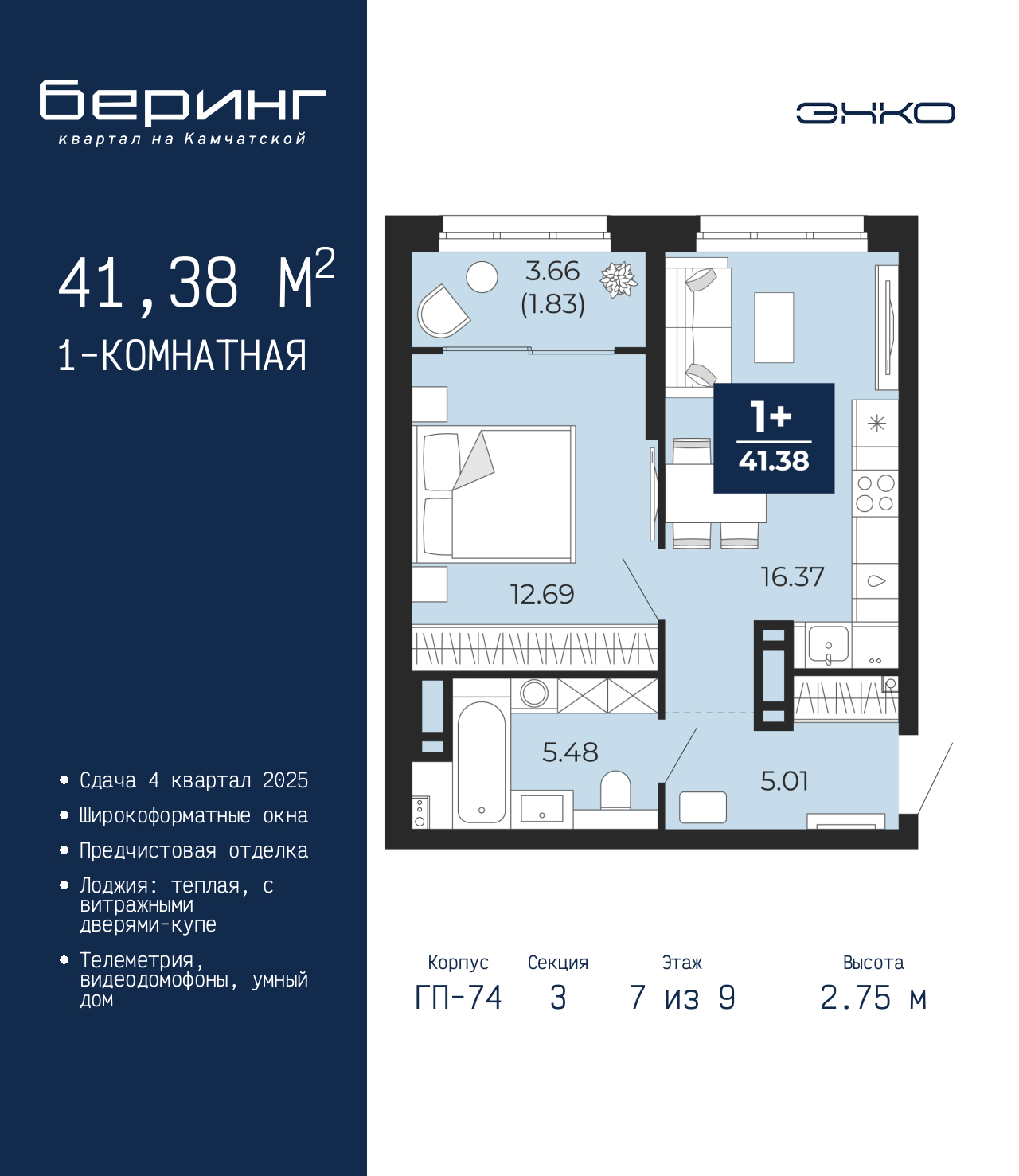 - Общая площадь 41.38 м²