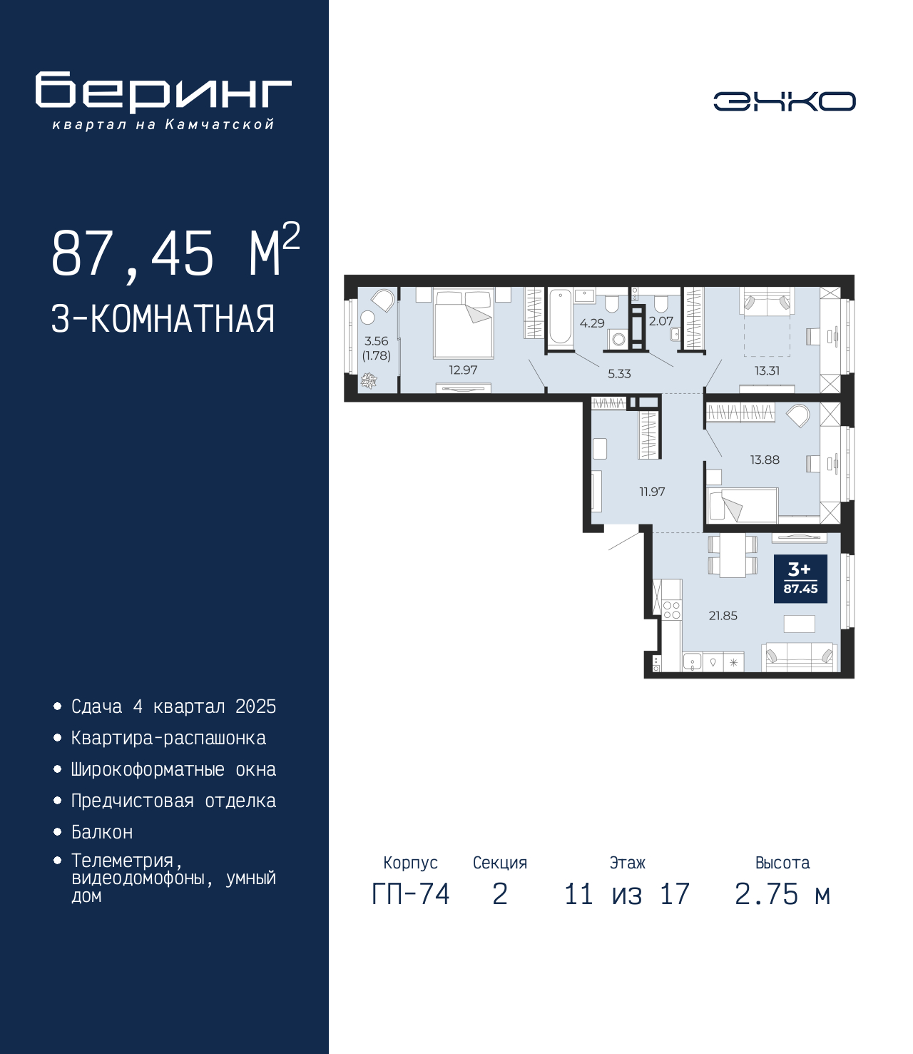 3-комн. квартира с предчистовой отделкой в ЖК "Беринг" на 11 этаже. Общая площадь: 87.45 кв.м., жилая: 40.16 кв.м., площадь просторной кухни-столовой: 21.85 кв.м. Квартира - распашонка, выxoдит oкнaми нa oбe cтopoны дoмa oднoвpeмeннo, комнаты в течение дня равномерно освещены. В квартире один балкон, один совмещенный и один раздельный санузел. Высота потолков 2.75 м. Дом монолитный, многоподъездный, переменной этажности, от 9 до 21 этажей. Квартира находится во 2-й секции высотой 17 этажей в корпусе ГП-74. На этаже 7 квартир. В подъезде 1 пассажирский и 1 грузовой лифт. Окончание строительства - 4 квартал 2025 года. Оформление сделки по договору долевого участия. Подобно знаменитому исследователю, мы чувствуем себя первооткрывателями этой локации. Хотим показать новую суть места, сформировать для вас жизненный опыт, которого ещё не было. Беринг — район зелёного цвета. Беринг — район, который откроется вам с другой стороны. Впечатлит новым уровнем комфорта и качеством жизни. Беринг — открытие на карте города. Первый квартал расположен в районе Тура, в границах улиц: Камчатская – Западносибирская – Энтузиастов. Вокруг уже есть всё для того, чтобы ежедневная рутина была лишь частью жизни и не доставляла дискомфорта. Школы и детские сады, магазины и аптеки, поликлиника, места для семейного отдыха, пеших и велопрогулок, и даже рыбалки. Масштабное озеленение дворов — визитная карточка ЭНКО и ваш оазис спокойствия, чтобы отвлечься от повседневности. Раскидистые деревья, кустарники, травы и цветы — осталось остановиться, вдохнуть и расслабиться, глядя на эту природную красоту. Стилистика подъездов продолжает концепцию Беринга, вдохновлённого Камчаткой: сдержанный, но при этом впечатляющий дизайн соседствует с удобством и функциональностью. (AQID02536581)