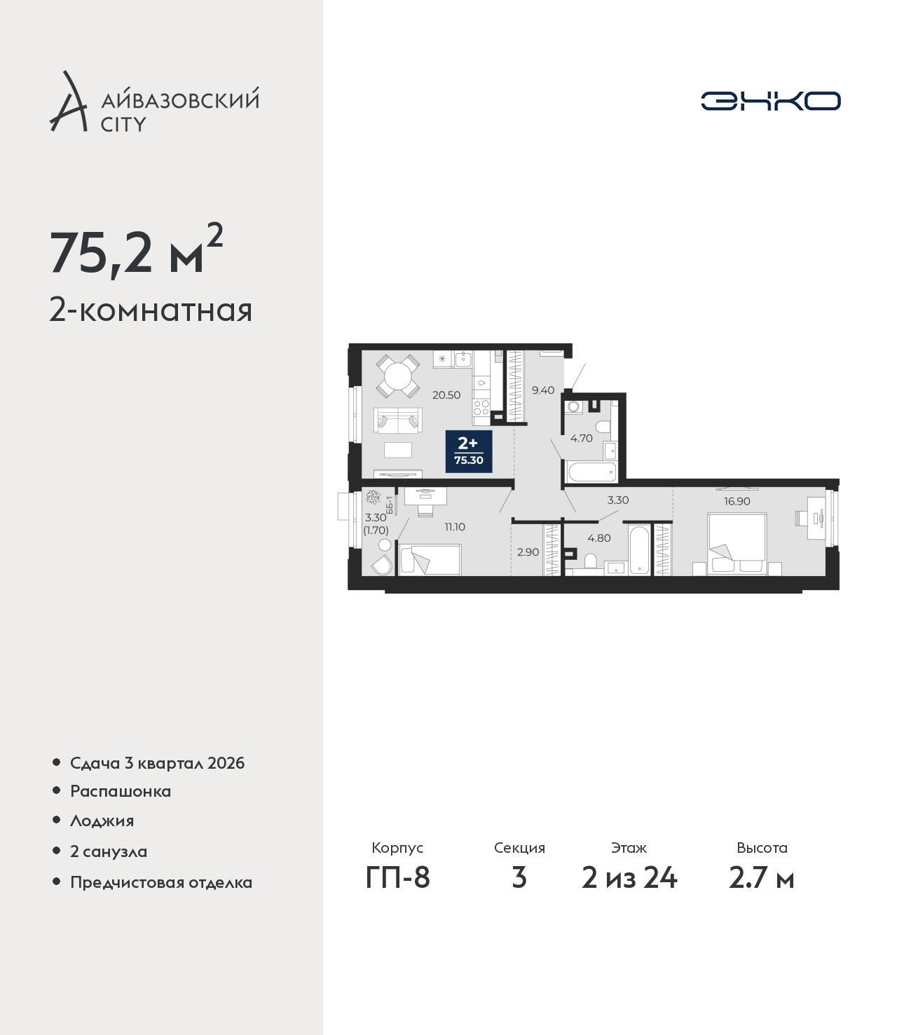 Просторная 2-комн. квартира с предчистовой отделкой в ЖК "Айвазовский City" на 2 этаже. Общая площадь: 75.2 кв.м., жилая: 28 кв.м., площадь просторной кухни-столовой: 20.5 кв.м. Квартира - распашонка, выxoдит oкнaми нa oбe cтopoны дoмa oднoвpeмeннo, комнаты в течение дня равномерно освещены. В квартире одна лоджия, два совмещенных санузла. Высота потолков 2.7 м. Дом монолитный, многоподъездный, переменной этажности, от 14 до 24 этажей. Квартира находится в 3-й секции высотой 24 этажа в корпусе ГП-8. На этаже 7 квартир. В подъезде 1 пассажирский и 1 грузовой лифт. Окончание строительства - 3 квартал 2026 года. Оформление сделки по договору долевого участия. Новый жилой район располагается в живописном месте на берегу Туры в центральной части города. Принципиально новое пространство для жизни в центре современного города для тех, чьи мечты сбываются, кто нацелен на постоянный рост, перемены к лучшему для себя и своих близких. Каждая деталь Айвазовский City вдохновляет и заряжает на новые свершения: авторская архитектура, сбалансированная продуманная инфраструктура, дизайнерские дворы со спортивными и детскими площадками, парковые зоны с фонтанами, водный канал, украшающий центральный прогулочный маршрут района и многое другое. В 2019 года проект стал лауреатом престижной премии Urban Awards 2019 в номинации «Лучший строящийся региональный жилой комплекс бизнес-класса». Главная особенность Айвазовский City - соседство разных архитектурных школ в рамках одного дома. Изысканная классика, выразительная эклектика и оригинальный модерн - жить в одном из таких домов настоящий повод для гордости. Айвазовский City это идеальное сочетание комфорта, технологий и развитой инфраструктуры. Вход в подъезд возможен с улицы и со двора. Отправляясь на работу или за покупками, жители могут выйти с внешней стороны дома, а для прогулки с ребенком – со стороны двора. Экологически чистые материалы и энергосберегающие технологии, качественное освещение общественных зон, видеонаблюдение по всей территории жилого района (в том числе в подъездах, лифтах и в подземном паркинге), закрытые дворы с доступом только для жителей Айвазовский City. Часть домов в Айвазовский City будут оснащены подземным паркингом. Востребованный в нашем климатическом поясе формат хранения автомобилей защитит собственность владельца в любое время года. Аккредитация в банках: «Сбербанк России», ОАО «Альфа-Банк», ПАО Банк «ВТБ», ПАО «Газпромбанк», ПАО Банк «ФК Открытие» и других. (AQID02488023)