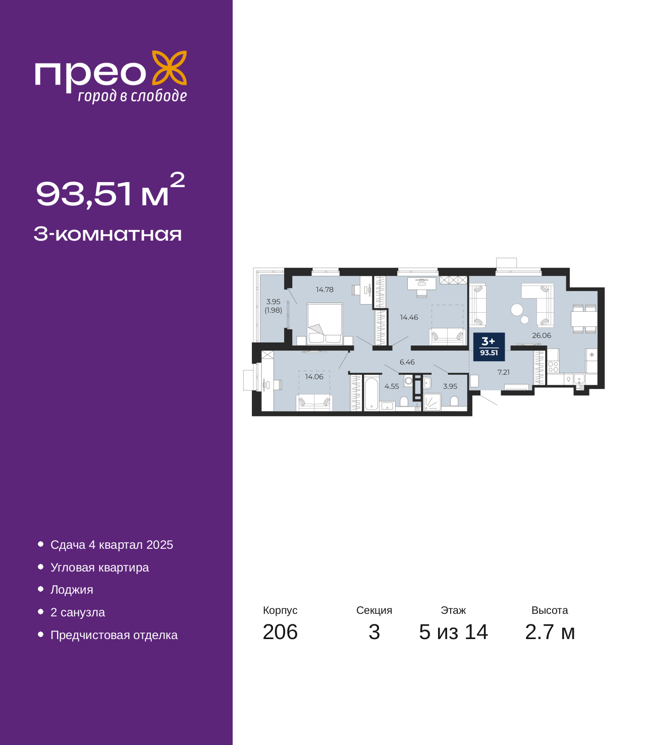 Продается трехкомнатная квартира с предчистовой отделкой в ЖК "Прео" на 5 этаже. Общая площадь: 93.51 кв.м., жилая: 43.3 кв.м., площадь просторной кухни-столовой: 26.06 кв.м. Угловая квартира, окна oбecпeчивaют paвнoмepнoe ocвeщeниe в тeчeниe дня. В квартире одна лоджия, два совмещенных санузла. Высота потолков 2.7 м. Дом монолитный, трехподъездный, переменной этажности, от 14 до 23 этажей. Квартира находится в 3-й секции высотой 14 этажей в корпусе 206. На этаже 6 квартир. В подъезде 1 пассажирский и 1 грузовой лифт. Окончание строительства - 4 квартал 2025 года. Оформление сделки по договору долевого участия. Преображенский — один из самых привлекательных районов для жизни! Это полностью самостоятельный жилой район с точки зрения инфраструктуры. Преображенский находится между Московским и Червишевским трактами в квартале улиц Закалужская — Вьюжная — Александра Протозанова. Не нужно ждать, когда появится инфраструктура — переезжайте на всё готовое. Вблизи расположены действующие школа и детский сад. В этом году откроется еще один сад, а в следующем году — школа. По соседству с Преображенским запланировано строительство городского парка «Комарово» площадью 38 гектар. За 10 минут можно доехать на автомобиле до крупных ТРЦ: «Лента», «Кристалл», «Леруа Мерлен», «Метро» и «Ашан». С 2018 года в районе открыт Соседский центр — пространство, созданное для формирования добрососедской среды, совместного досуга, общения и реализации соседских инициатив. Здесь проходят встречи соседей, а также сами жители района организовывают мероприятия. Организатором такого события может стать любой желающий. В квартирах выполнена качественная предчистовая отделка. Гладкие стены с финишным выравниванием по маякам. Ровный потолок для установки натяжного потолка. Установлены пятикамерные окна с двойным стеклопакетом (3 стекла). Дизайнерские холлы с видеонаблюдением, безбарьерным и прозрачным входом – всегда светло и спокойно. На первом этаже есть просторные колясочные, где все жители могут оставлять свои коляски и велосипеды. В Преображенском есть всё, что нужно для активного отдыха и занятий спортом. Мы сделали большое футбольное поле с безопасным покрытием. Также установили хоккейный корт, который оборудован по всем необходимым стандартам. Во дворах можно делать упражнения на специальных площадках с турниками. Весь район мы обустроили велодорожками, которые связаны в единый маршрут. У нас есть сухие фонтаны, бьющие из земли, деревья, веревки, сетки, скалодром, газон, песок и резинка — осталось просто дать своему ребенку право на свободную игру. По-настоящему хорошие дворы — это те, которые дети предпочитают соцсетям и телевизору. Аккредитация в банках: ПАО «Банк Уралсиб», «Сбербанк России», ПАО Банк «ВТБ», ПАО «Газпромбанк», ОАО «Альфа-Банк» и других. (AQID02488212)