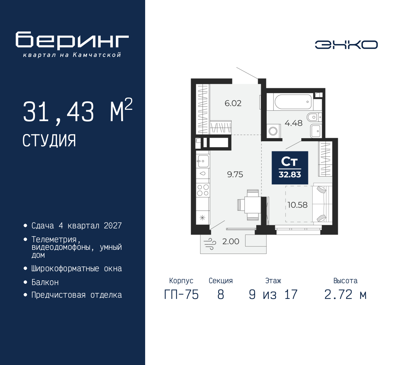 Однокомнатная квартира-студия от застройщика с предчистовой отделкой в ЖК "Беринг" на 9 этаже. Общая площадь: 31.43 кв.м., площадь гостиной 20.33 кв.м., из которых 9.75 кв.м. выделено под кухонную зону. Все окна выходят на одну сторону. В квартире один балкон, один совмещенный санузел. Высота потолков 2.72 м. Дом монолитный, многоподъездный, переменной этажности, от 17 до 24 этажей. Квартира находится в 8-й секции высотой 17 этажей в корпусе ГП-75. На этаже 8 квартир. В подъезде 2 пассажирских и 1 грузовой лифт. Окончание строительства - 4 квартал 2027 года. Оформление сделки по договору долевого участия. Подобно знаменитому исследователю, мы чувствуем себя первооткрывателями этой локации. Хотим показать новую суть места, сформировать для вас жизненный опыт, которого ещё не было. Беринг — район зелёного цвета. Беринг — район, который откроется вам с другой стороны. Впечатлит новым уровнем комфорта и качеством жизни. Беринг — открытие на карте города. Первый квартал расположен в районе Тура, в границах улиц: Камчатская – Западносибирская – Энтузиастов. Вокруг уже есть всё для того, чтобы ежедневная рутина была лишь частью жизни и не доставляла дискомфорта. Школы и детские сады, магазины и аптеки, поликлиника, места для семейного отдыха, пеших и велопрогулок, и даже рыбалки. Масштабное озеленение дворов — визитная карточка ЭНКО и ваш оазис спокойствия, чтобы отвлечься от повседневности. Раскидистые деревья, кустарники, травы и цветы — осталось остановиться, вдохнуть и расслабиться, глядя на эту природную красоту. Стилистика подъездов продолжает концепцию Беринга, вдохновлённого Камчаткой: сдержанный, но при этом впечатляющий дизайн соседствует с удобством и функциональностью. (AQID02529540)