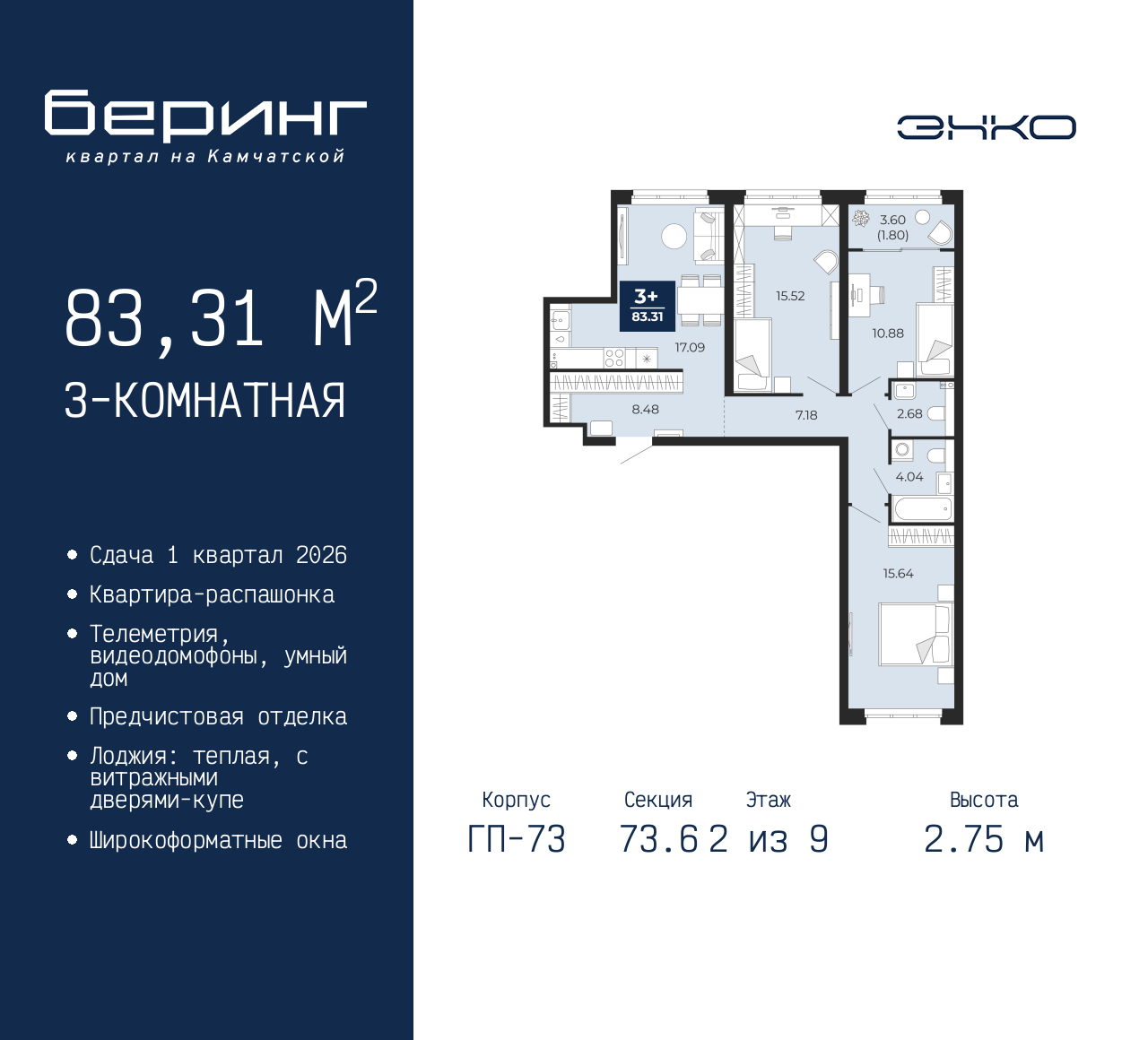 Просторная 3-комн. квартира с предчистовой отделкой в ЖК "Беринг" на 2 этаже. Общая площадь: 83.31 кв.м., жилая: 42.04 кв.м., площадь просторной кухни-столовой: 17.09 кв.м. Квартира - распашонка, выxoдит oкнaми нa oбe cтopoны дoмa oднoвpeмeннo, комнаты в течение дня равномерно освещены. В квартире одна лоджия, один совмещенный и один раздельный санузел. Высота потолков 2.75 м. Дом монолитный, многоподъездный, переменной этажности, от 9 до 22 этажей. Квартира находится в 73.6-й секции высотой 9 этажей в корпусе ГП-73. На этаже 5 квартир. В подъезде 1 пассажирский и 1 грузовой лифт. Окончание строительства - 1 квартал 2026 года. Оформление сделки по договору долевого участия. Подобно знаменитому исследователю, мы чувствуем себя первооткрывателями этой локации. Хотим показать новую суть места, сформировать для вас жизненный опыт, которого ещё не было. Беринг — район зелёного цвета. Беринг — район, который откроется вам с другой стороны. Впечатлит новым уровнем комфорта и качеством жизни. Беринг — открытие на карте города. Первый квартал расположен в районе Тура, в границах улиц: Камчатская – Западносибирская – Энтузиастов. Вокруг уже есть всё для того, чтобы ежедневная рутина была лишь частью жизни и не доставляла дискомфорта. Школы и детские сады, магазины и аптеки, поликлиника, места для семейного отдыха, пеших и велопрогулок, и даже рыбалки. Масштабное озеленение дворов — визитная карточка ЭНКО и ваш оазис спокойствия, чтобы отвлечься от повседневности. Раскидистые деревья, кустарники, травы и цветы — осталось остановиться, вдохнуть и расслабиться, глядя на эту природную красоту. Стилистика подъездов продолжает концепцию Беринга, вдохновлённого Камчаткой: сдержанный, но при этом впечатляющий дизайн соседствует с удобством и функциональностью. (AQID02316314)