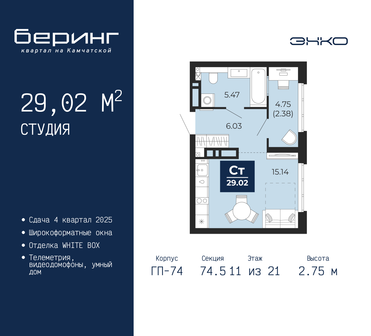 Однокомнатная квартира-студия с предчистовой отделкой в ЖК "Беринг" на 11 этаже. Общая площадь: 29.02 кв.м., площадь гостиной 15.14 кв.м., из которых 5 кв.м. выделено под кухонную зону. Все окна выходят на одну сторону. В квартире один совмещенный санузел. Высота потолков 2.75 м. Дом монолитный, многоподъездный, переменной этажности, от 9 до 21 этажей. Квартира находится в 74.5-й секции высотой 21 этаж в корпусе ГП-74. На этаже 7 квартир. В подъезде 1 пассажирский и 1 грузовой лифт. Окончание строительства - 1 квартал 2026 года. Оформление сделки по договору долевого участия. Подобно знаменитому исследователю, мы чувствуем себя первооткрывателями этой локации. Хотим показать новую суть места, сформировать для вас жизненный опыт, которого ещё не было. Беринг — район зелёного цвета. Беринг — район, который откроется вам с другой стороны. Впечатлит новым уровнем комфорта и качеством жизни. Беринг — открытие на карте города. Первый квартал расположен в районе Тура, в границах улиц: Камчатская – Западносибирская – Энтузиастов. Вокруг уже есть всё для того, чтобы ежедневная рутина была лишь частью жизни и не доставляла дискомфорта. Школы и детские сады, магазины и аптеки, поликлиника, места для семейного отдыха, пеших и велопрогулок, и даже рыбалки. Масштабное озеленение дворов — визитная карточка ЭНКО и ваш оазис спокойствия, чтобы отвлечься от повседневности. Раскидистые деревья, кустарники, травы и цветы — осталось остановиться, вдохнуть и расслабиться, глядя на эту природную красоту. Стилистика подъездов продолжает концепцию Беринга, вдохновлённого Камчаткой: сдержанный, но при этом впечатляющий дизайн соседствует с удобством и функциональностью. (AQID02315447)
