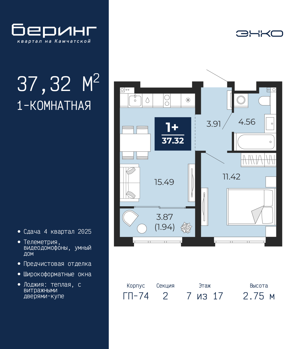 1-комн. квартира от застройщика с предчистовой отделкой в ЖК "Беринг" на 7 этаже. Общая площадь: 37.32 кв.м., жилая: 11.42 кв.м., площадь просторной кухни-столовой: 15.49 кв.м. Все окна выходят на одну сторону. В квартире одна лоджия, один совмещенный санузел. Высота потолков 2.75 м. Дом монолитный, многоподъездный, переменной этажности, от 9 до 21 этажей. Квартира находится во 2-й секции высотой 17 этажей в корпусе ГП-74. На этаже 7 квартир. В подъезде 1 пассажирский и 1 грузовой лифт. Окончание строительства - 1 квартал 2026 года. Оформление сделки по договору долевого участия. Подобно знаменитому исследователю, мы чувствуем себя первооткрывателями этой локации. Хотим показать новую суть места, сформировать для вас жизненный опыт, которого ещё не было. Беринг — район зелёного цвета. Беринг — район, который откроется вам с другой стороны. Впечатлит новым уровнем комфорта и качеством жизни. Беринг — открытие на карте города. Первый квартал расположен в районе Тура, в границах улиц: Камчатская – Западносибирская – Энтузиастов. Вокруг уже есть всё для того, чтобы ежедневная рутина была лишь частью жизни и не доставляла дискомфорта. Школы и детские сады, магазины и аптеки, поликлиника, места для семейного отдыха, пеших и велопрогулок, и даже рыбалки. Масштабное озеленение дворов — визитная карточка ЭНКО и ваш оазис спокойствия, чтобы отвлечься от повседневности. Раскидистые деревья, кустарники, травы и цветы — осталось остановиться, вдохнуть и расслабиться, глядя на эту природную красоту. Стилистика подъездов продолжает концепцию Беринга, вдохновлённого Камчаткой: сдержанный, но при этом впечатляющий дизайн соседствует с удобством и функциональностью. (AQID02315580)