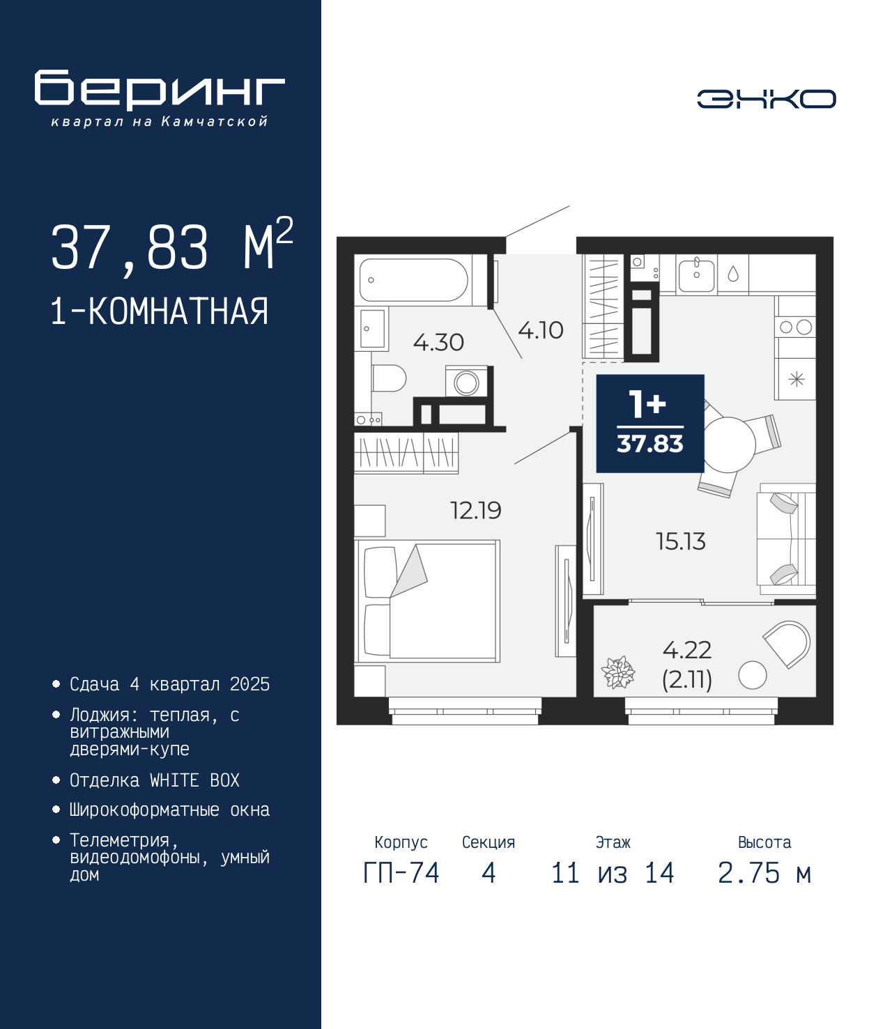 Однокомнатная квартира с предчистовой отделкой в ЖК "Беринг" на 11 этаже. Общая площадь: 37.83 кв.м., жилая: 12.19 кв.м., площадь просторной кухни-столовой: 15.13 кв.м. Все окна выходят на одну сторону. В квартире одна лоджия, один совмещенный санузел. Высота потолков 2.75 м. Дом монолитный, многоподъездный, переменной этажности, от 9 до 21 этажей. Квартира находится в 4-й секции высотой 14 этажей в корпусе ГП-74. На этаже 7 квартир. В подъезде 1 пассажирский и 1 грузовой лифт. Окончание строительства - 1 квартал 2026 года. Оформление сделки по договору долевого участия. Подобно знаменитому исследователю, мы чувствуем себя первооткрывателями этой локации. Хотим показать новую суть места, сформировать для вас жизненный опыт, которого ещё не было. Беринг — район зелёного цвета. Беринг — район, который откроется вам с другой стороны. Впечатлит новым уровнем комфорта и качеством жизни. Беринг — открытие на карте города. Первый квартал расположен в районе Тура, в границах улиц: Камчатская – Западносибирская – Энтузиастов. Вокруг уже есть всё для того, чтобы ежедневная рутина была лишь частью жизни и не доставляла дискомфорта. Школы и детские сады, магазины и аптеки, поликлиника, места для семейного отдыха, пеших и велопрогулок, и даже рыбалки. Масштабное озеленение дворов — визитная карточка ЭНКО и ваш оазис спокойствия, чтобы отвлечься от повседневности. Раскидистые деревья, кустарники, травы и цветы — осталось остановиться, вдохнуть и расслабиться, глядя на эту природную красоту. Стилистика подъездов продолжает концепцию Беринга, вдохновлённого Камчаткой: сдержанный, но при этом впечатляющий дизайн соседствует с удобством и функциональностью. (AQID02315671)