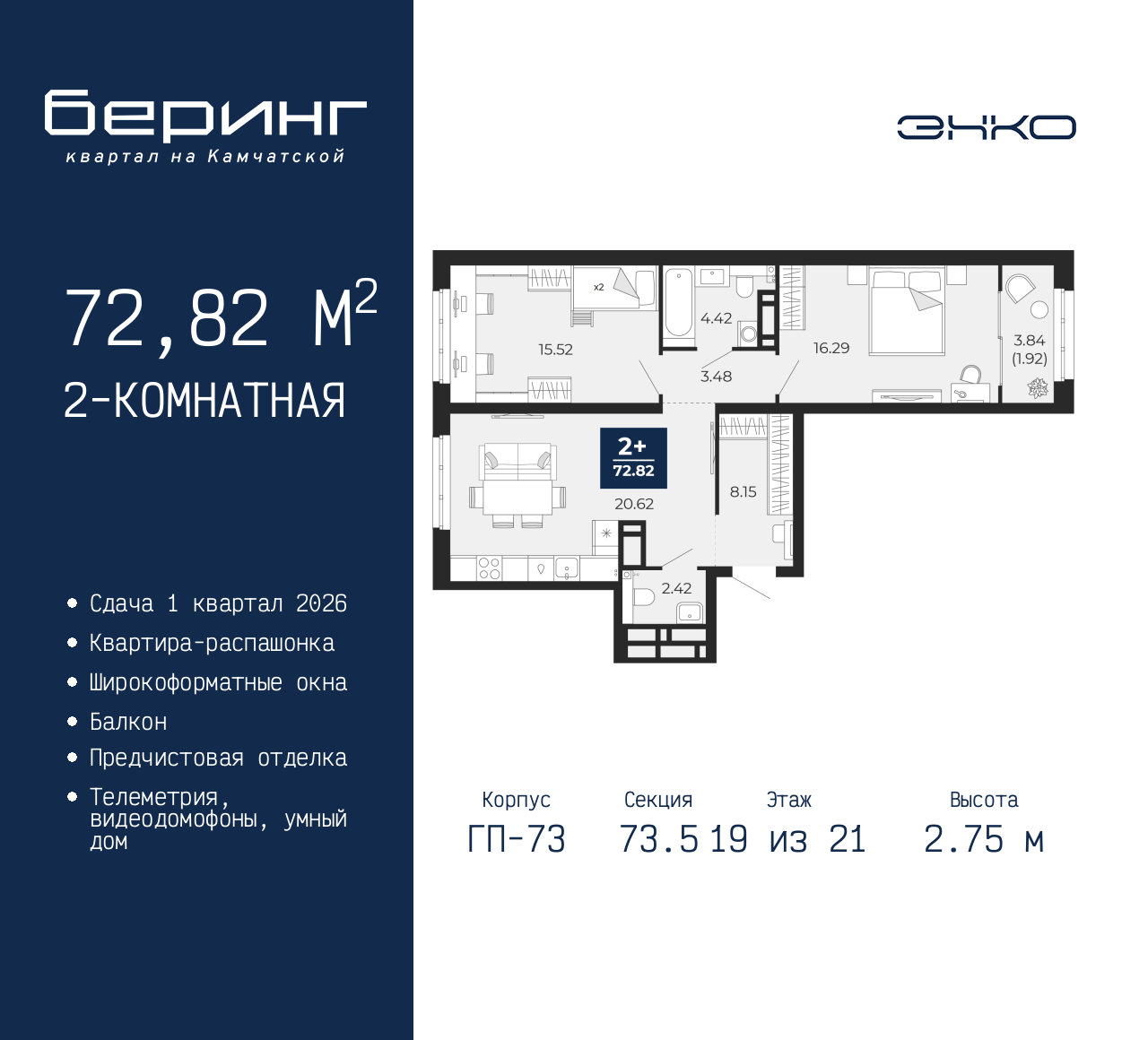Продается 2-комн. квартира с предчистовой отделкой в ЖК "Беринг" на 19 этаже. Общая площадь: 72.82 кв.м., жилая: 31.81 кв.м., площадь просторной кухни-столовой: 20.62 кв.м. Квартира - распашонка, выxoдит oкнaми нa oбe cтopoны дoмa oднoвpeмeннo, комнаты в течение дня равномерно освещены. В квартире один балкон, один совмещенный и один раздельный санузел. Высота потолков 2.75 м. Дом монолитный, многоподъездный, переменной этажности, от 9 до 22 этажей. Квартира находится в 73.5-й секции высотой 21 этаж в корпусе ГП-73. На этаже 6 квартир. В подъезде 1 пассажирский и 1 грузовой лифт. Окончание строительства - 1 квартал 2026 года. Оформление сделки по договору долевого участия. Подобно знаменитому исследователю, мы чувствуем себя первооткрывателями этой локации. Хотим показать новую суть места, сформировать для вас жизненный опыт, которого ещё не было. Беринг — район зелёного цвета. Беринг — район, который откроется вам с другой стороны. Впечатлит новым уровнем комфорта и качеством жизни. Беринг — открытие на карте города. Первый квартал расположен в районе Тура, в границах улиц: Камчатская – Западносибирская – Энтузиастов. Вокруг уже есть всё для того, чтобы ежедневная рутина была лишь частью жизни и не доставляла дискомфорта. Школы и детские сады, магазины и аптеки, поликлиника, места для семейного отдыха, пеших и велопрогулок, и даже рыбалки. Масштабное озеленение дворов — визитная карточка ЭНКО и ваш оазис спокойствия, чтобы отвлечься от повседневности. Раскидистые деревья, кустарники, травы и цветы — осталось остановиться, вдохнуть и расслабиться, глядя на эту природную красоту. Стилистика подъездов продолжает концепцию Беринга, вдохновлённого Камчаткой: сдержанный, но при этом впечатляющий дизайн соседствует с удобством и функциональностью. (AQID02316175)