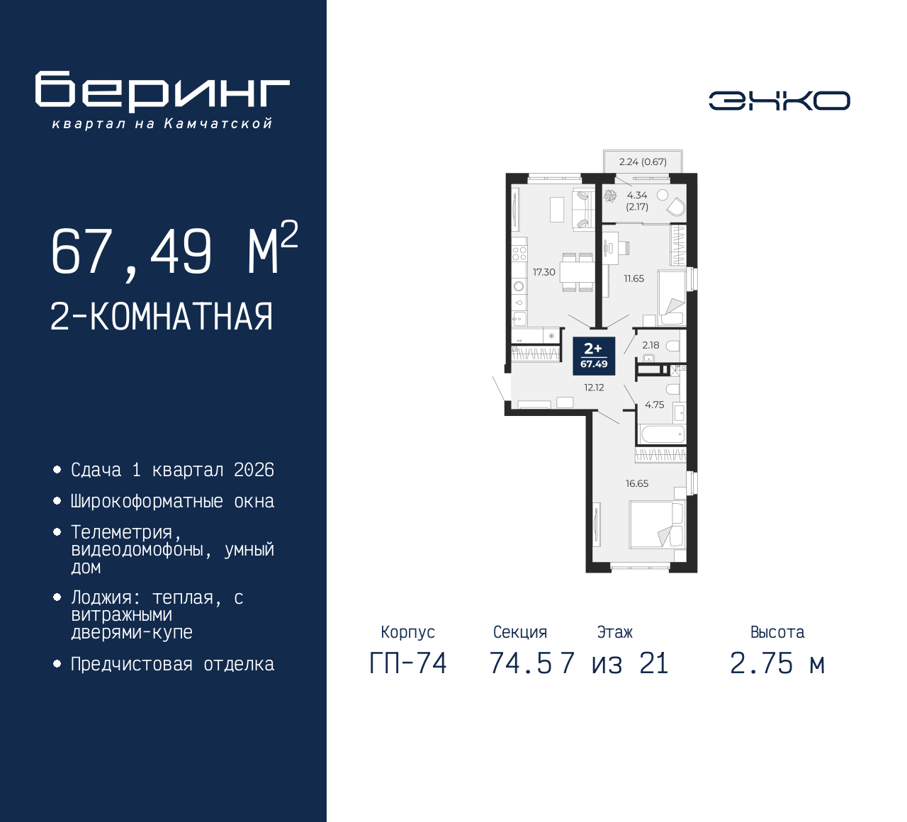 Двухкомнатная квартира с предчистовой отделкой в ЖК "Беринг" на 7 этаже. Общая площадь: 67.49 кв.м., жилая: 28.3 кв.м., площадь просторной кухни-столовой: 17.3 кв.м. Квартира без проходных комнат, окна выходят нa три cтopoны дома. В квартире один балкон и одна лоджия, один совмещенный и один раздельный санузел. Высота потолков 2.75 м. Дом монолитный, многоподъездный, переменной этажности, от 9 до 21 этажей. Квартира находится в 74.5-й секции высотой 21 этаж в корпусе ГП-74. На этаже 7 квартир. В подъезде 1 пассажирский и 1 грузовой лифт. Окончание строительства - 1 квартал 2026 года. Оформление сделки по договору долевого участия. Подобно знаменитому исследователю, мы чувствуем себя первооткрывателями этой локации. Хотим показать новую суть места, сформировать для вас жизненный опыт, которого ещё не было. Беринг — район зелёного цвета. Беринг — район, который откроется вам с другой стороны. Впечатлит новым уровнем комфорта и качеством жизни. Беринг — открытие на карте города. Первый квартал расположен в районе Тура, в границах улиц: Камчатская – Западносибирская – Энтузиастов. Вокруг уже есть всё для того, чтобы ежедневная рутина была лишь частью жизни и не доставляла дискомфорта. Школы и детские сады, магазины и аптеки, поликлиника, места для семейного отдыха, пеших и велопрогулок, и даже рыбалки. Масштабное озеленение дворов — визитная карточка ЭНКО и ваш оазис спокойствия, чтобы отвлечься от повседневности. Раскидистые деревья, кустарники, травы и цветы — осталось остановиться, вдохнуть и расслабиться, глядя на эту природную красоту. Стилистика подъездов продолжает концепцию Беринга, вдохновлённого Камчаткой: сдержанный, но при этом впечатляющий дизайн соседствует с удобством и функциональностью. (AQID02316210)