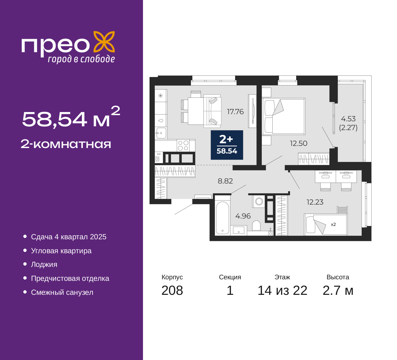Просторная двухкомнатная квартира с предчистовой отделкой в ЖК "Прео" на 14 этаже. Общая площадь: 58.54 кв.м., жилая: 24.73 кв.м., площадь просторной кухни-столовой: 17.76 кв.м. Квартира угловая, окна oбecпeчивaют paвнoмepнoe ocвeщeниe в тeчeниe дня. В квартире одна лоджия, один совмещенный санузел. Высота потолков 2.7 м. Дом монолитный, трехподъездный, переменной этажности, от 14 до 22 этажей. Квартира находится в 1-й секции высотой 22 этажа в корпусе 208. На этаже 8 квартир. В подъезде 1 пассажирский и 1 грузовой лифт. Окончание строительства - 4 квартал 2025 года. Оформление сделки по договору долевого участия. Преображенский — один из самых привлекательных районов для жизни! Это полностью самостоятельный жилой район с точки зрения инфраструктуры. Преображенский находится между Московским и Червишевским трактами в квартале улиц Закалужская — Вьюжная — Александра Протозанова. Не нужно ждать, когда появится инфраструктура — переезжайте на всё готовое. Вблизи расположены действующие школа и детский сад. В этом году откроется еще один сад, а в следующем году — школа. По соседству с Преображенским запланировано строительство городского парка «Комарово» площадью 38 гектар. За 10 минут можно доехать на автомобиле до крупных ТРЦ: «Лента», «Кристалл», «Леруа Мерлен», «Метро» и «Ашан». С 2018 года в районе открыт Соседский центр — пространство, созданное для формирования добрососедской среды, совместного досуга, общения и реализации соседских инициатив. Здесь проходят встречи соседей, а также сами жители района организовывают мероприятия. Организатором такого события может стать любой желающий. В квартирах выполнена качественная предчистовая отделка. Гладкие стены с финишным выравниванием по маякам. Ровный потолок для установки натяжного потолка. Установлены пятикамерные окна с двойным стеклопакетом (3 стекла). Дизайнерские холлы с видеонаблюдением, безбарьерным и прозрачным входом – всегда светло и спокойно. На первом этаже есть просторные колясочные, где все жители могут оставлять свои коляски и велосипеды. В Преображенском есть всё, что нужно для активного отдыха и занятий спортом. Мы сделали большое футбольное поле с безопасным покрытием. Также установили хоккейный корт, который оборудован по всем необходимым стандартам. Во дворах можно делать упражнения на специальных площадках с турниками. Весь район мы обустроили велодорожками, которые связаны в единый маршрут. У нас есть сухие фонтаны, бьющие из земли, деревья, веревки, сетки, скалодром, газон, песок и резинка — осталось просто дать своему ребенку право на свободную игру. По-настоящему хорошие дворы — это те, которые дети предпочитают соцсетям и телевизору. Аккредитация в банках: «Сбербанк России», ПАО «Банк Уралсиб», ПАО Банк «ВТБ», ПАО «Газпромбанк», ОАО «Альфа-Банк» и других. (AQID02355715)