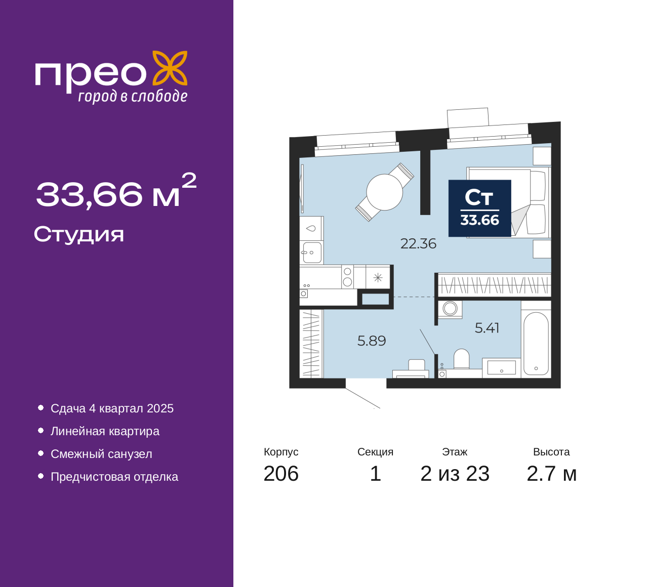 1-комн. квартира-студия от застройщика с предчистовой отделкой в ЖК "Прео" на 2 этаже. Общая площадь: 33.66 кв.м., площадь гостиной 22.36 кв.м., из которых 10 кв.м. выделено под кухонную зону. Все окна выходят на одну сторону. В квартире один совмещенный санузел. Высота потолков 2.7 м. Дом монолитный, трехподъездный, переменной этажности, от 14 до 23 этажей. Квартира находится в 1-й секции высотой 23 этажа в корпусе 206. На этаже 8 квартир. В подъезде 1 пассажирский и 1 грузовой лифт. Окончание строительства - 4 квартал 2025 года. Оформление сделки по договору долевого участия. Преображенский — один из самых привлекательных районов для жизни! Это полностью самостоятельный жилой район с точки зрения инфраструктуры. Преображенский находится между Московским и Червишевским трактами в квартале улиц Закалужская — Вьюжная — Александра Протозанова. Не нужно ждать, когда появится инфраструктура — переезжайте на всё готовое. Вблизи расположены действующие школа и детский сад. В этом году откроется еще один сад, а в следующем году — школа. По соседству с Преображенским запланировано строительство городского парка «Комарово» площадью 38 гектар. За 10 минут можно доехать на автомобиле до крупных ТРЦ: «Лента», «Кристалл», «Леруа Мерлен», «Метро» и «Ашан». С 2018 года в районе открыт Соседский центр — пространство, созданное для формирования добрососедской среды, совместного досуга, общения и реализации соседских инициатив. Здесь проходят встречи соседей, а также сами жители района организовывают мероприятия. Организатором такого события может стать любой желающий. В квартирах выполнена качественная предчистовая отделка. Гладкие стены с финишным выравниванием по маякам. Ровный потолок для установки натяжного потолка. Установлены пятикамерные окна с двойным стеклопакетом (3 стекла). Дизайнерские холлы с видеонаблюдением, безбарьерным и прозрачным входом – всегда светло и спокойно. На первом этаже есть просторные колясочные, где все жители могут оставлять свои коляски и велосипеды. В Преображенском есть всё, что нужно для активного отдыха и занятий спортом. Мы сделали большое футбольное поле с безопасным покрытием. Также установили хоккейный корт, который оборудован по всем необходимым стандартам. Во дворах можно делать упражнения на специальных площадках с турниками. Весь район мы обустроили велодорожками, которые связаны в единый маршрут. У нас есть сухие фонтаны, бьющие из земли, деревья, веревки, сетки, скалодром, газон, песок и резинка — осталось просто дать своему ребенку право на свободную игру. По-настоящему хорошие дворы — это те, которые дети предпочитают соцсетям и телевизору. Аккредитация в банках: «Сбербанк России», ПАО «Газпромбанк», ОАО «Альфа-Банк», ПАО Банк «ВТБ», ПАО «Банк Уралсиб» и других. (AQID02392038)