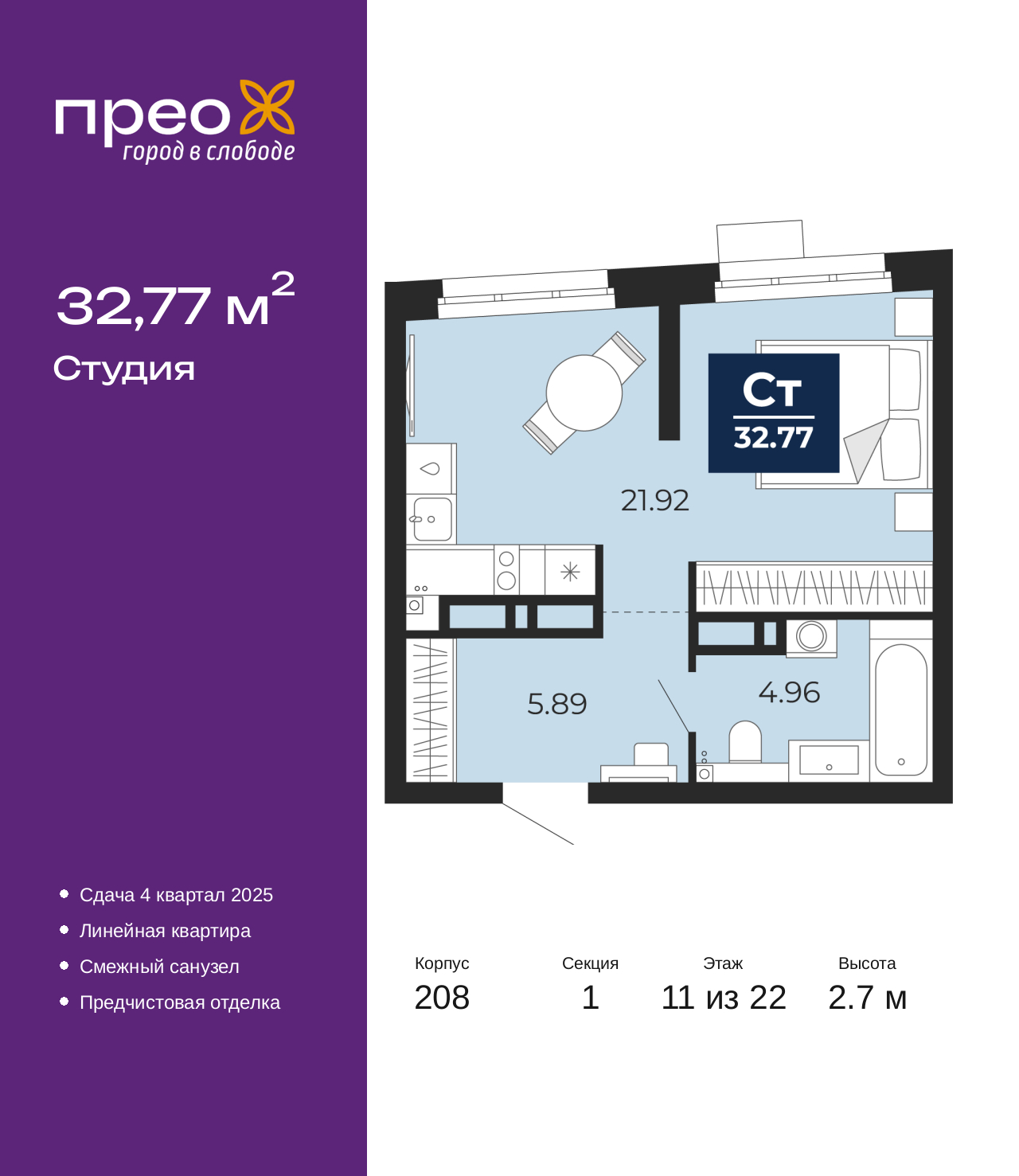 Продается однокомнатная квартира-студия с предчистовой отделкой в ЖК "Прео" на 11 этаже. Общая площадь: 32.77 кв.м., площадь гостиной 21.92 кв.м., из которых 5 кв.м. выделено под кухонную зону. Все окна выходят на одну сторону. В квартире один совмещенный санузел. Высота потолков 2.7 м. Дом монолитный, трехподъездный, переменной этажности, от 14 до 22 этажей. Квартира находится в 1-й секции высотой 22 этажа в корпусе 208. На этаже 8 квартир. В подъезде 1 пассажирский и 1 грузовой лифт. Окончание строительства - 4 квартал 2025 года. Оформление сделки по договору долевого участия. Преображенский — один из самых привлекательных районов для жизни! Это полностью самостоятельный жилой район с точки зрения инфраструктуры. Преображенский находится между Московским и Червишевским трактами в квартале улиц Закалужская — Вьюжная — Александра Протозанова. Не нужно ждать, когда появится инфраструктура — переезжайте на всё готовое. Вблизи расположены действующие школа и детский сад. В этом году откроется еще один сад, а в следующем году — школа. По соседству с Преображенским запланировано строительство городского парка «Комарово» площадью 38 гектар. За 10 минут можно доехать на автомобиле до крупных ТРЦ: «Лента», «Кристалл», «Леруа Мерлен», «Метро» и «Ашан». С 2018 года в районе открыт Соседский центр — пространство, созданное для формирования добрососедской среды, совместного досуга, общения и реализации соседских инициатив. Здесь проходят встречи соседей, а также сами жители района организовывают мероприятия. Организатором такого события может стать любой желающий. В квартирах выполнена качественная предчистовая отделка. Гладкие стены с финишным выравниванием по маякам. Ровный потолок для установки натяжного потолка. Установлены пятикамерные окна с двойным стеклопакетом (3 стекла). Дизайнерские холлы с видеонаблюдением, безбарьерным и прозрачным входом – всегда светло и спокойно. На первом этаже есть просторные колясочные, где все жители могут оставлять свои коляски и велосипеды. В Преображенском есть всё, что нужно для активного отдыха и занятий спортом. Мы сделали большое футбольное поле с безопасным покрытием. Также установили хоккейный корт, который оборудован по всем необходимым стандартам. Во дворах можно делать упражнения на специальных площадках с турниками. Весь район мы обустроили велодорожками, которые связаны в единый маршрут. У нас есть сухие фонтаны, бьющие из земли, деревья, веревки, сетки, скалодром, газон, песок и резинка — осталось просто дать своему ребенку право на свободную игру. По-настоящему хорошие дворы — это те, которые дети предпочитают соцсетям и телевизору. Аккредитация в банках: ОАО «Альфа-Банк», ПАО «Банк Уралсиб», ПАО «Газпромбанк», «Сбербанк России», ПАО Банк «ВТБ» и других. (AQID02441393)