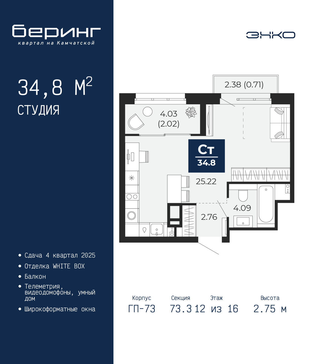Продается 1-комн. квартира-студия с предчистовой отделкой в ЖК "Беринг" на 12 этаже. Общая площадь: 34.8 кв.м., площадь гостиной 25.22 кв.м., из которых 5 кв.м. выделено под кухонную зону. Все окна выходят на одну сторону. В квартире один балкон, один совмещенный санузел. Высота потолков 2.75 м. Дом монолитный, многоподъездный, переменной этажности, от 9 до 22 этажей. Квартира находится в 73.3-й секции высотой 16 этажей в корпусе ГП-73. На этаже 8 квартир. В подъезде 1 пассажирский и 1 грузовой лифт. Окончание строительства - 4 квартал 2025 года. Оформление сделки по договору долевого участия. Подобно знаменитому исследователю, мы чувствуем себя первооткрывателями этой локации. Хотим показать новую суть места, сформировать для вас жизненный опыт, которого ещё не было. Беринг — район зелёного цвета. Беринг — район, который откроется вам с другой стороны. Впечатлит новым уровнем комфорта и качеством жизни. Беринг — открытие на карте города. Первый квартал расположен в районе Тура, в границах улиц: Камчатская – Западносибирская – Энтузиастов. Вокруг уже есть всё для того, чтобы ежедневная рутина была лишь частью жизни и не доставляла дискомфорта. Школы и детские сады, магазины и аптеки, поликлиника, места для семейного отдыха, пеших и велопрогулок, и даже рыбалки. Масштабное озеленение дворов — визитная карточка ЭНКО и ваш оазис спокойствия, чтобы отвлечься от повседневности. Раскидистые деревья, кустарники, травы и цветы — осталось остановиться, вдохнуть и расслабиться, глядя на эту природную красоту. Стилистика подъездов продолжает концепцию Беринга, вдохновлённого Камчаткой: сдержанный, но при этом впечатляющий дизайн соседствует с удобством и функциональностью. (AQID02315566)