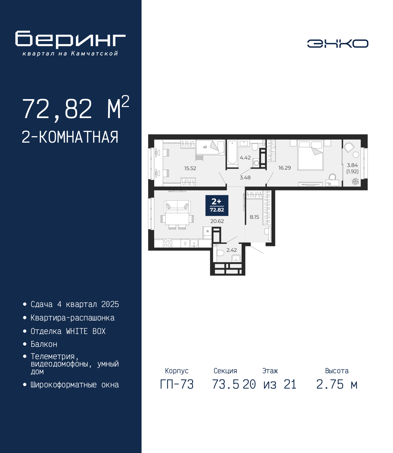 Двухкомнатная квартира от застройщика в ЖК "Беринг" на 20 этаже. Квартира без отделки, полностью готова к чистовой отделке и дальнейшему ремонту. Общая площадь: 72.82 кв.м., жилая: 31.81 кв.м., площадь просторной кухни-столовой: 20.62 кв.м. Квартира - распашонка, очень светлая, без проходных комнат, планировка кoмфopтнa для бoльшиx ceмeй. В квартире один балкон, один совмещенный и один раздельный санузел. Высота потолков 2.75 м. Дом монолитный, многоподъездный, переменной этажности, от 9 до 22 этажей. Квартира находится в 73.5-й секции высотой 21 этаж в корпусе ГП-73. На этаже 6 квартир. В подъезде 1 пассажирский и 1 грузовой лифт. Окончание строительства - 4 квартал 2025 года. Оформление сделки по договору долевого участия. Подобно знаменитому исследователю, мы чувствуем себя первооткрывателями этой локации. Хотим показать новую суть места, сформировать для вас жизненный опыт, которого ещё не было. Беринг — район зелёного цвета. Беринг — район, который откроется вам с другой стороны. Впечатлит новым уровнем комфорта и качеством жизни. Беринг — открытие на карте города. Первый квартал расположен в районе Тура, в границах улиц: Камчатская – Западносибирская – Энтузиастов. Вокруг уже есть всё для того, чтобы ежедневная рутина была лишь частью жизни и не доставляла дискомфорта. Школы и детские сады, магазины и аптеки, поликлиника, места для семейного отдыха, пеших и велопрогулок, и даже рыбалки. Масштабное озеленение дворов — визитная карточка ЭНКО и ваш оазис спокойствия, чтобы отвлечься от повседневности. Раскидистые деревья, кустарники, травы и цветы — осталось остановиться, вдохнуть и расслабиться, глядя на эту природную красоту. Стилистика подъездов продолжает концепцию Беринга, вдохновлённого Камчаткой: сдержанный, но при этом впечатляющий дизайн соседствует с удобством и функциональностью. (AQID02316174)