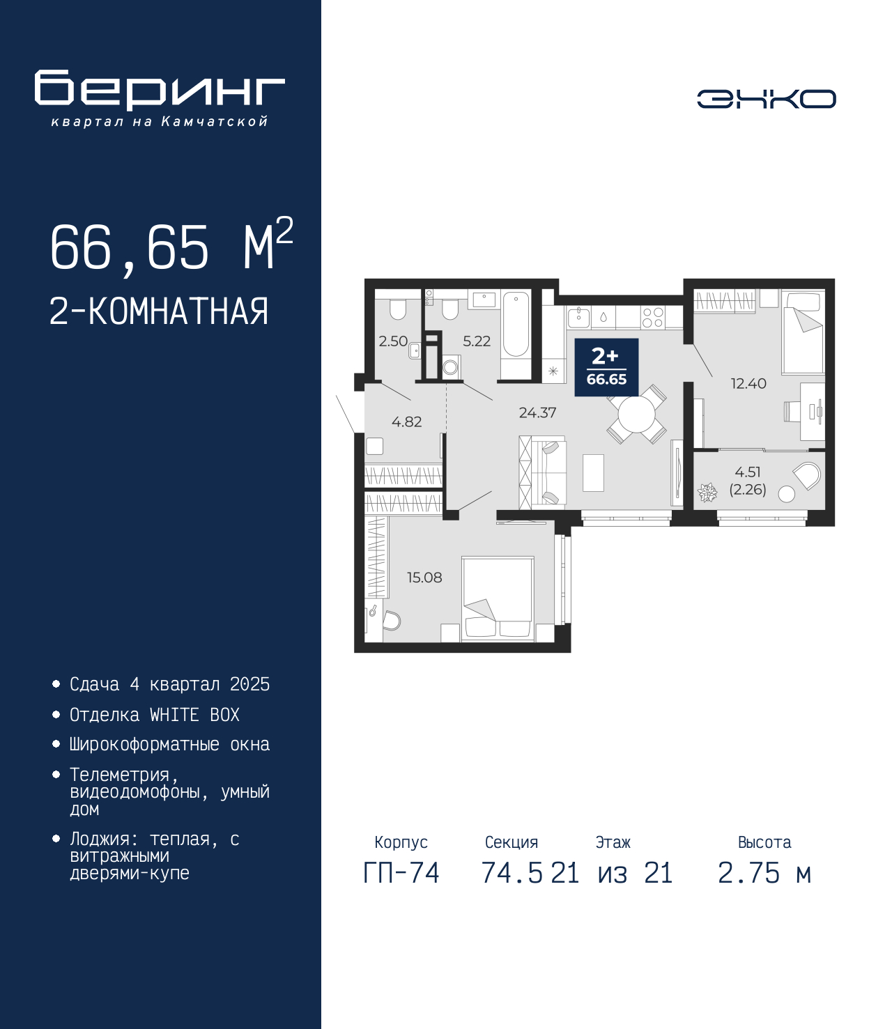 2-комн. квартира с предчистовой отделкой в ЖК "Беринг" на 21 этаже. Общая площадь: 66.65 кв.м., жилая: 27.48 кв.м., площадь просторной кухни-столовой: 24.37 кв.м. Угловая квартира, очень светлая, естественная вентиляция при открытии окон. В квартире одна лоджия, один совмещенный и один раздельный санузел. Высота потолков 2.75 м. Дом монолитный, многоподъездный, переменной этажности, от 9 до 21 этажей. Квартира находится в 74.5-й секции высотой 21 этаж в корпусе ГП-74. На этаже 7 квартир. В подъезде 1 пассажирский и 1 грузовой лифт. Окончание строительства - 4 квартал 2025 года. Оформление сделки по договору долевого участия. Подобно знаменитому исследователю, мы чувствуем себя первооткрывателями этой локации. Хотим показать новую суть места, сформировать для вас жизненный опыт, которого ещё не было. Беринг — район зелёного цвета. Беринг — район, который откроется вам с другой стороны. Впечатлит новым уровнем комфорта и качеством жизни. Беринг — открытие на карте города. Первый квартал расположен в районе Тура, в границах улиц: Камчатская – Западносибирская – Энтузиастов. Вокруг уже есть всё для того, чтобы ежедневная рутина была лишь частью жизни и не доставляла дискомфорта. Школы и детские сады, магазины и аптеки, поликлиника, места для семейного отдыха, пеших и велопрогулок, и даже рыбалки. Масштабное озеленение дворов — визитная карточка ЭНКО и ваш оазис спокойствия, чтобы отвлечься от повседневности. Раскидистые деревья, кустарники, травы и цветы — осталось остановиться, вдохнуть и расслабиться, глядя на эту природную красоту. Стилистика подъездов продолжает концепцию Беринга, вдохновлённого Камчаткой: сдержанный, но при этом впечатляющий дизайн соседствует с удобством и функциональностью. (AQID02316169)