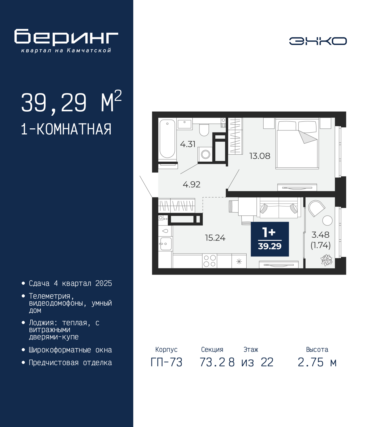 Просторная однокомнатная квартира с предчистовой отделкой в ЖК "Беринг" на 8 этаже. Общая площадь: 39.29 кв.м., жилая: 13.08 кв.м., площадь просторной кухни-столовой: 15.24 кв.м. Все окна выходят на одну сторону. В квартире одна лоджия, один совмещенный санузел. Высота потолков 2.75 м. Дом монолитный, многоподъездный, переменной этажности, от 9 до 22 этажей. Квартира находится в 73.2-й секции высотой 22 этажа в корпусе ГП-73. На этаже 7 квартир. В подъезде 1 пассажирский и 1 грузовой лифт. Окончание строительства - 4 квартал 2025 года. Оформление сделки по договору долевого участия. Подобно знаменитому исследователю, мы чувствуем себя первооткрывателями этой локации. Хотим показать новую суть места, сформировать для вас жизненный опыт, которого ещё не было. Беринг — район зелёного цвета. Беринг — район, который откроется вам с другой стороны. Впечатлит новым уровнем комфорта и качеством жизни. Беринг — открытие на карте города. Первый квартал расположен в районе Тура, в границах улиц: Камчатская – Западносибирская – Энтузиастов. Вокруг уже есть всё для того, чтобы ежедневная рутина была лишь частью жизни и не доставляла дискомфорта. Школы и детские сады, магазины и аптеки, поликлиника, места для семейного отдыха, пеших и велопрогулок, и даже рыбалки. Масштабное озеленение дворов — визитная карточка ЭНКО и ваш оазис спокойствия, чтобы отвлечься от повседневности. Раскидистые деревья, кустарники, травы и цветы — осталось остановиться, вдохнуть и расслабиться, глядя на эту природную красоту. Стилистика подъездов продолжает концепцию Беринга, вдохновлённого Камчаткой: сдержанный, но при этом впечатляющий дизайн соседствует с удобством и функциональностью. (AQID02315707)