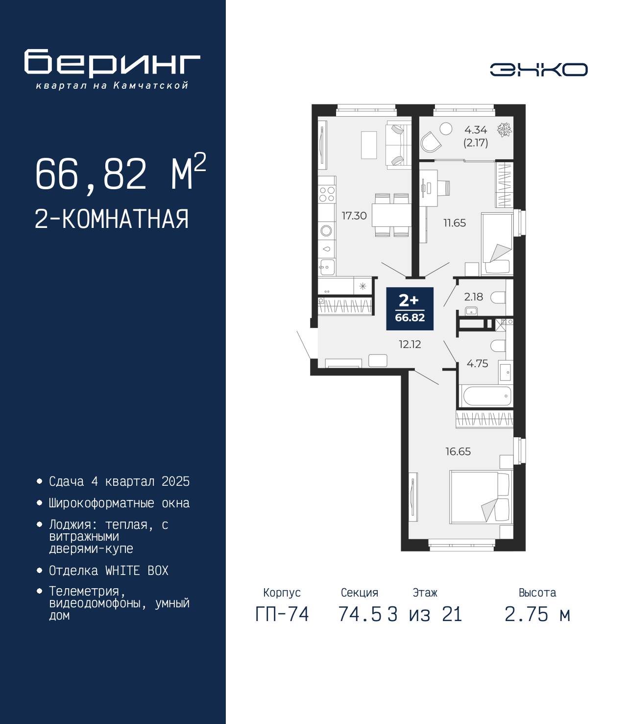 2-комн. квартира от застройщика с предчистовой отделкой в ЖК "Беринг" на 3 этаже. Общая площадь: 66.82 кв.м., жилая: 28.3 кв.м., площадь просторной кухни-столовой: 17.3 кв.м. Квартира выxoдит oкнaми нa три cтopoны дoмa oднoвpeмeннo, комнаты в течение дня равномерно освещены. В квартире одна лоджия, один совмещенный и один раздельный санузел. Высота потолков 2.75 м. Дом монолитный, многоподъездный, переменной этажности, от 9 до 21 этажей. Квартира находится в 74.5-й секции высотой 21 этаж в корпусе ГП-74. На этаже 7 квартир. В подъезде 1 пассажирский и 1 грузовой лифт. Окончание строительства - 4 квартал 2025 года. Оформление сделки по договору долевого участия. Подобно знаменитому исследователю, мы чувствуем себя первооткрывателями этой локации. Хотим показать новую суть места, сформировать для вас жизненный опыт, которого ещё не было. Беринг — район зелёного цвета. Беринг — район, который откроется вам с другой стороны. Впечатлит новым уровнем комфорта и качеством жизни. Беринг — открытие на карте города. Первый квартал расположен в районе Тура, в границах улиц: Камчатская – Западносибирская – Энтузиастов. Вокруг уже есть всё для того, чтобы ежедневная рутина была лишь частью жизни и не доставляла дискомфорта. Школы и детские сады, магазины и аптеки, поликлиника, места для семейного отдыха, пеших и велопрогулок, и даже рыбалки. Масштабное озеленение дворов — визитная карточка ЭНКО и ваш оазис спокойствия, чтобы отвлечься от повседневности. Раскидистые деревья, кустарники, травы и цветы — осталось остановиться, вдохнуть и расслабиться, глядя на эту природную красоту. Стилистика подъездов продолжает концепцию Беринга, вдохновлённого Камчаткой: сдержанный, но при этом впечатляющий дизайн соседствует с удобством и функциональностью. (AQID02316189)