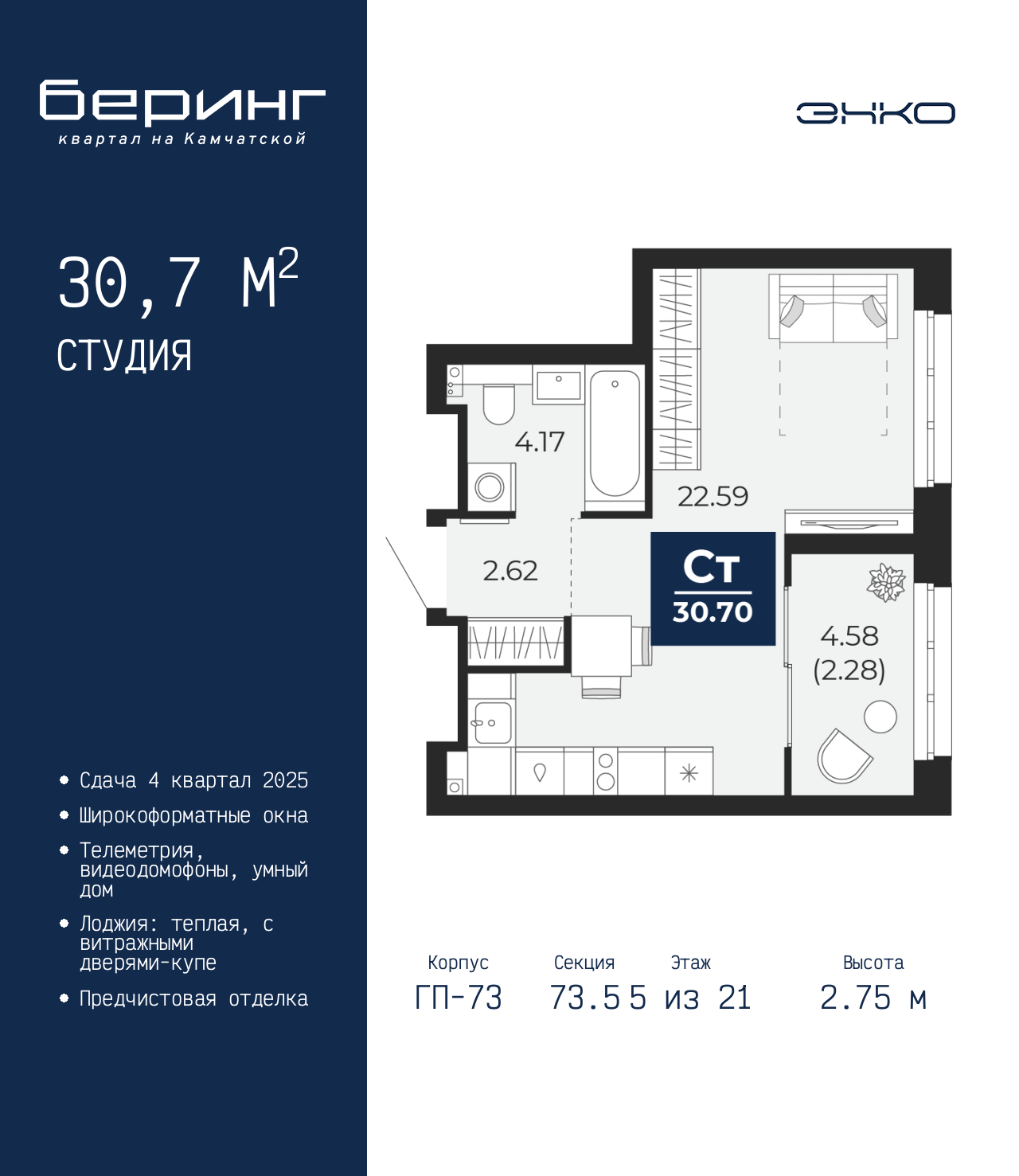 1-комн. квартира-студия с предчистовой отделкой в ЖК "Беринг" на 5 этаже. Общая площадь: 30.7 кв.м., площадь гостиной 21.36 кв.м., из которых 5 кв.м. выделено под кухонную зону. Все окна выходят на одну сторону. В квартире одна лоджия, один совмещенный санузел. Высота потолков 2.75 м. Дом монолитный, многоподъездный, переменной этажности, от 9 до 22 этажей. Квартира находится в 73.5-й секции высотой 21 этаж в корпусе ГП-73. На этаже 6 квартир. В подъезде 1 пассажирский и 1 грузовой лифт. Окончание строительства - 4 квартал 2025 года. Оформление сделки по договору долевого участия. Подобно знаменитому исследователю, мы чувствуем себя первооткрывателями этой локации. Хотим показать новую суть места, сформировать для вас жизненный опыт, которого ещё не было. Беринг — район зелёного цвета. Беринг — район, который откроется вам с другой стороны. Впечатлит новым уровнем комфорта и качеством жизни. Беринг — открытие на карте города. Первый квартал расположен в районе Тура, в границах улиц: Камчатская – Западносибирская – Энтузиастов. Вокруг уже есть всё для того, чтобы ежедневная рутина была лишь частью жизни и не доставляла дискомфорта. Школы и детские сады, магазины и аптеки, поликлиника, места для семейного отдыха, пеших и велопрогулок, и даже рыбалки. Масштабное озеленение дворов — визитная карточка ЭНКО и ваш оазис спокойствия, чтобы отвлечься от повседневности. Раскидистые деревья, кустарники, травы и цветы — осталось остановиться, вдохнуть и расслабиться, глядя на эту природную красоту. Стилистика подъездов продолжает концепцию Беринга, вдохновлённого Камчаткой: сдержанный, но при этом впечатляющий дизайн соседствует с удобством и функциональностью. (AQID02315464)