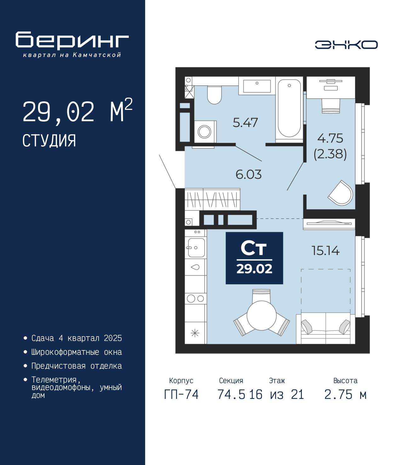 Просторная 1-комн. квартира-студия с предчистовой отделкой в ЖК "Беринг" на 16 этаже. Общая площадь: 29.02 кв.м., площадь гостиной 15.14 кв.м., из которых 5 кв.м. выделено под кухонную зону. Все окна выходят на одну сторону. В квартире один совмещенный санузел. Высота потолков 2.75 м. Дом монолитный, многоподъездный, переменной этажности, от 9 до 21 этажей. Квартира находится в 74.5-й секции высотой 21 этаж в корпусе ГП-74. На этаже 7 квартир. В подъезде 1 пассажирский и 1 грузовой лифт. Окончание строительства - 4 квартал 2025 года. Оформление сделки по договору долевого участия. Подобно знаменитому исследователю, мы чувствуем себя первооткрывателями этой локации. Хотим показать новую суть места, сформировать для вас жизненный опыт, которого ещё не было. Беринг — район зелёного цвета. Беринг — район, который откроется вам с другой стороны. Впечатлит новым уровнем комфорта и качеством жизни. Беринг — открытие на карте города. Первый квартал расположен в районе Тура, в границах улиц: Камчатская – Западносибирская – Энтузиастов. Вокруг уже есть всё для того, чтобы ежедневная рутина была лишь частью жизни и не доставляла дискомфорта. Школы и детские сады, магазины и аптеки, поликлиника, места для семейного отдыха, пеших и велопрогулок, и даже рыбалки. Масштабное озеленение дворов — визитная карточка ЭНКО и ваш оазис спокойствия, чтобы отвлечься от повседневности. Раскидистые деревья, кустарники, травы и цветы — осталось остановиться, вдохнуть и расслабиться, глядя на эту природную красоту. Стилистика подъездов продолжает концепцию Беринга, вдохновлённого Камчаткой: сдержанный, но при этом впечатляющий дизайн соседствует с удобством и функциональностью. (AQID02315442)