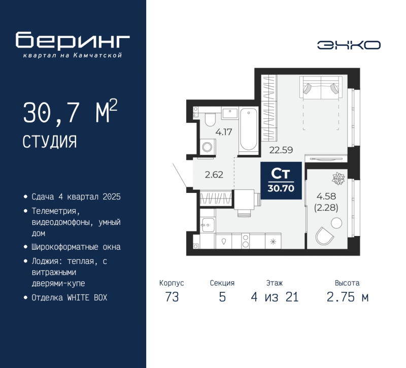 Продается 1-комн. квартира-студия с предчистовой отделкой в ЖК "Беринг" на 4 этаже. Общая площадь: 30.7 кв.м., площадь гостиной 21.36 кв.м., из которых 5 кв.м. выделено под кухонную зону. Все окна выходят на одну сторону. В квартире одна лоджия, один совмещенный санузел. Высота потолков 2.75 м. Дом монолитный, многоподъездный, переменной этажности, от 9 до 22 этажей. Квартира находится в 73.5-й секции высотой 21 этаж в корпусе ГП-73. На этаже 6 квартир. В подъезде 1 пассажирский и 1 грузовой лифт. Окончание строительства - 4 квартал 2025 года. Оформление сделки по договору долевого участия. Подобно знаменитому исследователю, мы чувствуем себя первооткрывателями этой локации. Хотим показать новую суть места, сформировать для вас жизненный опыт, которого ещё не было. Беринг — район зелёного цвета. Беринг — район, который откроется вам с другой стороны. Впечатлит новым уровнем комфорта и качеством жизни. Беринг — открытие на карте города. Первый квартал расположен в районе Тура, в границах улиц: Камчатская – Западносибирская – Энтузиастов. Вокруг уже есть всё для того, чтобы ежедневная рутина была лишь частью жизни и не доставляла дискомфорта. Школы и детские сады, магазины и аптеки, поликлиника, места для семейного отдыха, пеших и велопрогулок, и даже рыбалки. Масштабное озеленение дворов — визитная карточка ЭНКО и ваш оазис спокойствия, чтобы отвлечься от повседневности. Раскидистые деревья, кустарники, травы и цветы — осталось остановиться, вдохнуть и расслабиться, глядя на эту природную красоту. Стилистика подъездов продолжает концепцию Беринга, вдохновлённого Камчаткой: сдержанный, но при этом впечатляющий дизайн соседствует с удобством и функциональностью. (AQID02315465)