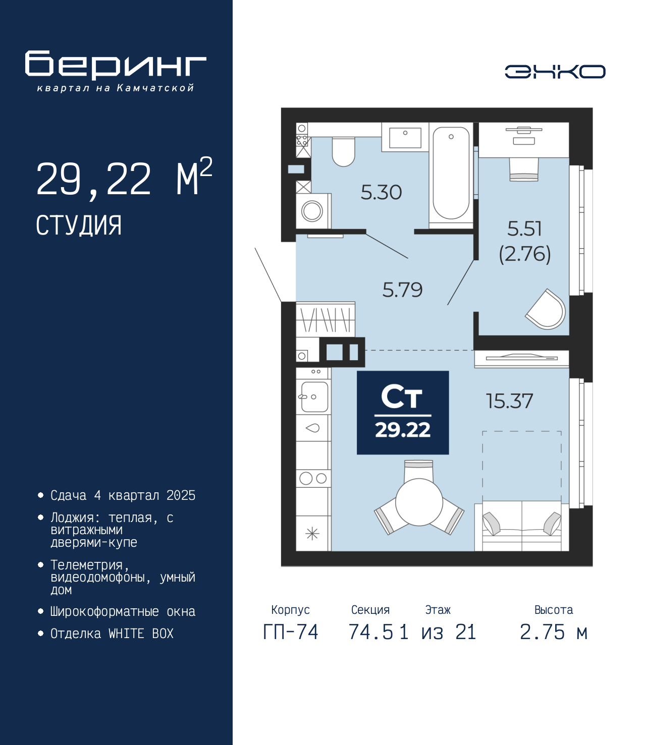 Продается 1-комн. квартира-студия с предчистовой отделкой в ЖК "Беринг" на 1 этаже. Общая площадь: 29.22 кв.м., площадь гостиной 15.37 кв.м., из которых 5 кв.м. выделено под кухонную зону. Все окна выходят на одну сторону. В квартире одна лоджия, один совмещенный санузел. Высота потолков 2.75 м. Дом монолитный, многоподъездный, переменной этажности, от 9 до 21 этажей. Квартира находится в 74.5-й секции высотой 21 этаж в корпусе ГП-74. На этаже 7 квартир. В подъезде 1 пассажирский и 1 грузовой лифт. Окончание строительства - 4 квартал 2025 года. Оформление сделки по договору долевого участия. Подобно знаменитому исследователю, мы чувствуем себя первооткрывателями этой локации. Хотим показать новую суть места, сформировать для вас жизненный опыт, которого ещё не было. Беринг — район зелёного цвета. Беринг — район, который откроется вам с другой стороны. Впечатлит новым уровнем комфорта и качеством жизни. Беринг — открытие на карте города. Первый квартал расположен в районе Тура, в границах улиц: Камчатская – Западносибирская – Энтузиастов. Вокруг уже есть всё для того, чтобы ежедневная рутина была лишь частью жизни и не доставляла дискомфорта. Школы и детские сады, магазины и аптеки, поликлиника, места для семейного отдыха, пеших и велопрогулок, и даже рыбалки. Масштабное озеленение дворов — визитная карточка ЭНКО и ваш оазис спокойствия, чтобы отвлечься от повседневности. Раскидистые деревья, кустарники, травы и цветы — осталось остановиться, вдохнуть и расслабиться, глядя на эту природную красоту. Стилистика подъездов продолжает концепцию Беринга, вдохновлённого Камчаткой: сдержанный, но при этом впечатляющий дизайн соседствует с удобством и функциональностью. (AQID02315455)