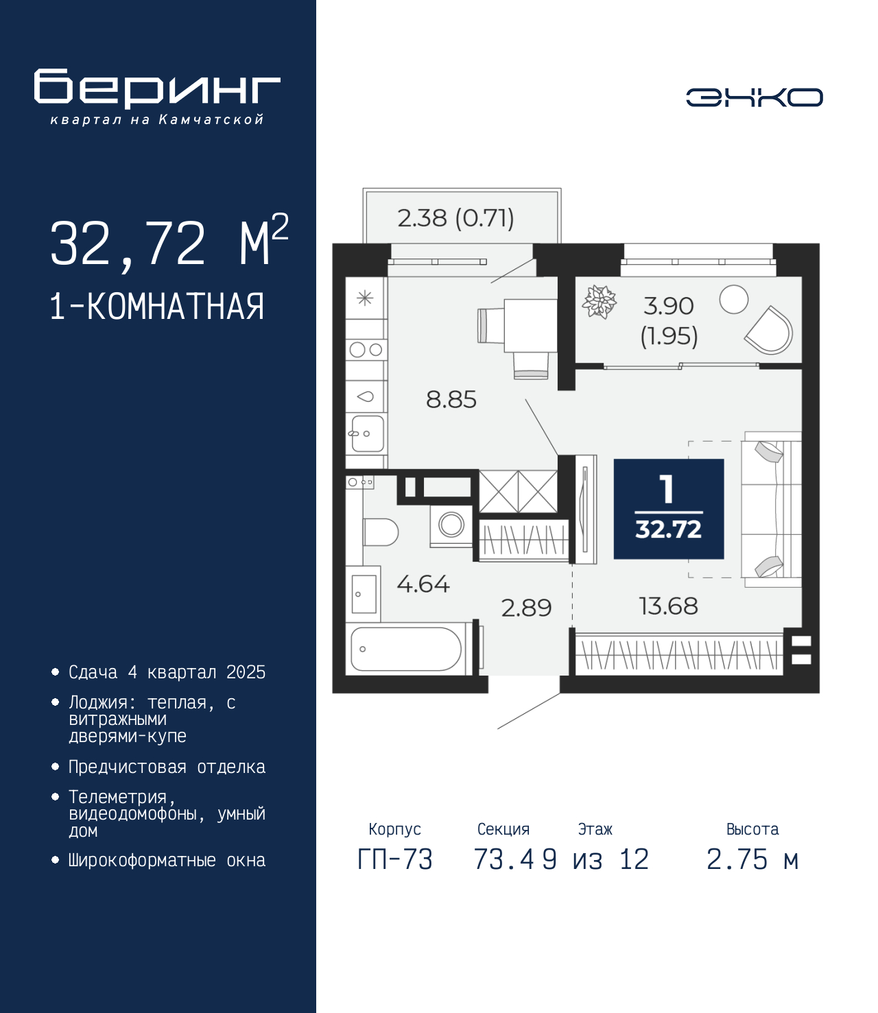 Продается 1-комн. квартира от застройщика с предчистовой отделкой в ЖК "Беринг" на 9 этаже. Общая площадь: 32.72 кв.м., жилая: 13.68 кв.м., площадь кухни: 8.85 кв.м. Все окна выходят на одну сторону. В квартире один балкон и одна лоджия, один совмещенный санузел. Высота потолков 2.75 м. Дом монолитный, многоподъездный, переменной этажности, от 9 до 22 этажей. Квартира находится в 73.4-й секции высотой 12 этажей в корпусе ГП-73. На этаже 8 квартир. В подъезде 1 пассажирский и 1 грузовой лифт. Окончание строительства - 4 квартал 2025 года. Оформление сделки по договору долевого участия. Подобно знаменитому исследователю, мы чувствуем себя первооткрывателями этой локации. Хотим показать новую суть места, сформировать для вас жизненный опыт, которого ещё не было. Беринг — район зелёного цвета. Беринг — район, который откроется вам с другой стороны. Впечатлит новым уровнем комфорта и качеством жизни. Беринг — открытие на карте города. Первый квартал расположен в районе Тура, в границах улиц: Камчатская – Западносибирская – Энтузиастов. Вокруг уже есть всё для того, чтобы ежедневная рутина была лишь частью жизни и не доставляла дискомфорта. Школы и детские сады, магазины и аптеки, поликлиника, места для семейного отдыха, пеших и велопрогулок, и даже рыбалки. Масштабное озеленение дворов — визитная карточка ЭНКО и ваш оазис спокойствия, чтобы отвлечься от повседневности. Раскидистые деревья, кустарники, травы и цветы — осталось остановиться, вдохнуть и расслабиться, глядя на эту природную красоту. Стилистика подъездов продолжает концепцию Беринга, вдохновлённого Камчаткой: сдержанный, но при этом впечатляющий дизайн соседствует с удобством и функциональностью. (AQID02315480)