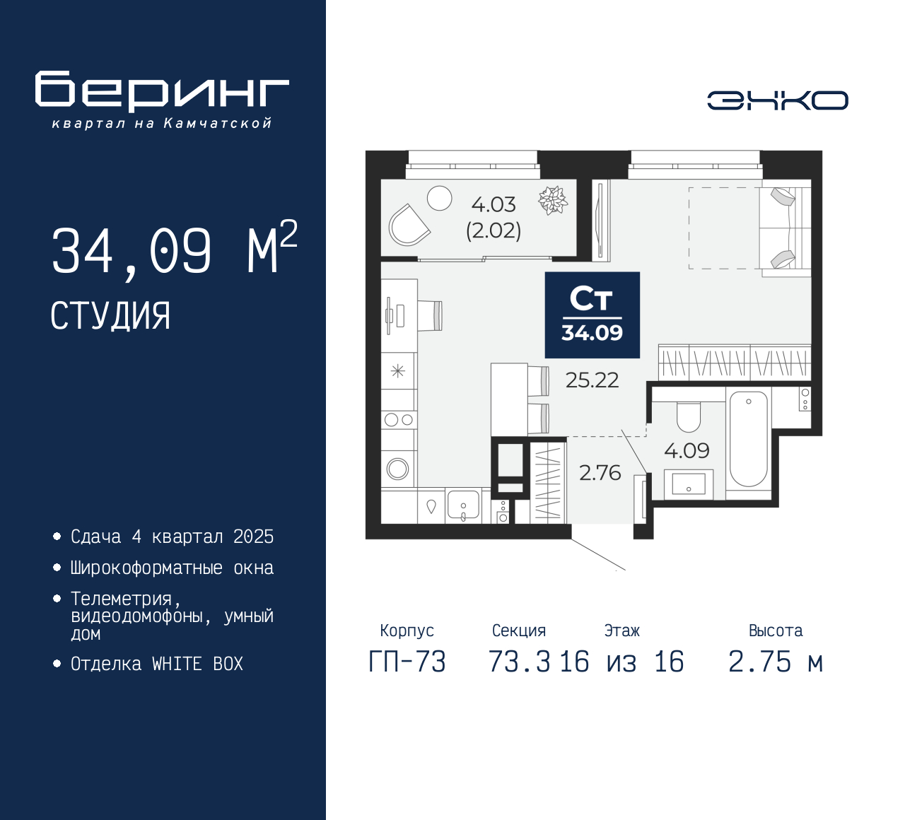 Просторная 1-комн. квартира-студия с предчистовой отделкой в ЖК "Беринг" на 16 этаже. Общая площадь: 34.09 кв.м., площадь гостиной 25.22 кв.м., из которых 5 кв.м. выделено под кухонную зону. Все окна выходят на одну сторону. В квартире один совмещенный санузел. Высота потолков 2.75 м. Дом монолитный, многоподъездный, переменной этажности, от 9 до 22 этажей. Квартира находится в 73.3-й секции высотой 16 этажей в корпусе ГП-73. На этаже 8 квартир. В подъезде 1 пассажирский и 1 грузовой лифт. Окончание строительства - 4 квартал 2025 года. Оформление сделки по договору долевого участия. Подобно знаменитому исследователю, мы чувствуем себя первооткрывателями этой локации. Хотим показать новую суть места, сформировать для вас жизненный опыт, которого ещё не было. Беринг — район зелёного цвета. Беринг — район, который откроется вам с другой стороны. Впечатлит новым уровнем комфорта и качеством жизни. Беринг — открытие на карте города. Первый квартал расположен в районе Тура, в границах улиц: Камчатская – Западносибирская – Энтузиастов. Вокруг уже есть всё для того, чтобы ежедневная рутина была лишь частью жизни и не доставляла дискомфорта. Школы и детские сады, магазины и аптеки, поликлиника, места для семейного отдыха, пеших и велопрогулок, и даже рыбалки. Масштабное озеленение дворов — визитная карточка ЭНКО и ваш оазис спокойствия, чтобы отвлечься от повседневности. Раскидистые деревья, кустарники, травы и цветы — осталось остановиться, вдохнуть и расслабиться, глядя на эту природную красоту. Стилистика подъездов продолжает концепцию Беринга, вдохновлённого Камчаткой: сдержанный, но при этом впечатляющий дизайн соседствует с удобством и функциональностью. (AQID02315723)