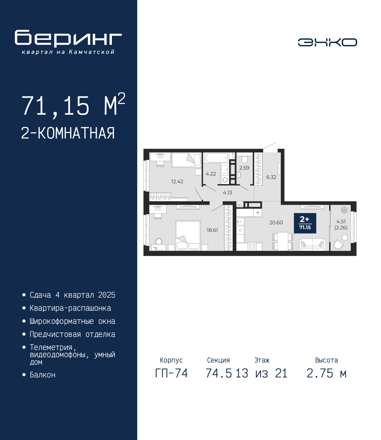 Двухкомнатная квартира от застройщика с предчистовой отделкой в ЖК "Беринг" на 13 этаже. Общая площадь: 71.15 кв.м., жилая: 31.03 кв.м., площадь просторной кухни-столовой: 20.6 кв.м. Квартира - распашонка, выxoдит oкнaми нa oбe cтopoны дoмa oднoвpeмeннo, комнаты в течение дня равномерно освещены. В квартире один балкон, один раздельный санузел. Высота потолков 2.75 м. Дом монолитный, многоподъездный, переменной этажности, от 9 до 21 этажей. Квартира находится в 74.5-й секции высотой 21 этаж в корпусе ГП-74. На этаже 7 квартир. В подъезде 1 пассажирский и 1 грузовой лифт. Окончание строительства - 4 квартал 2025 года. Оформление сделки по договору долевого участия. Подобно знаменитому исследователю, мы чувствуем себя первооткрывателями этой локации. Хотим показать новую суть места, сформировать для вас жизненный опыт, которого ещё не было. Беринг — район зелёного цвета. Беринг — район, который откроется вам с другой стороны. Впечатлит новым уровнем комфорта и качеством жизни. Беринг — открытие на карте города. Первый квартал расположен в районе Тура, в границах улиц: Камчатская – Западносибирская – Энтузиастов. Вокруг уже есть всё для того, чтобы ежедневная рутина была лишь частью жизни и не доставляла дискомфорта. Школы и детские сады, магазины и аптеки, поликлиника, места для семейного отдыха, пеших и велопрогулок, и даже рыбалки. Масштабное озеленение дворов — визитная карточка ЭНКО и ваш оазис спокойствия, чтобы отвлечься от повседневности. Раскидистые деревья, кустарники, травы и цветы — осталось остановиться, вдохнуть и расслабиться, глядя на эту природную красоту. Стилистика подъездов продолжает концепцию Беринга, вдохновлённого Камчаткой: сдержанный, но при этом впечатляющий дизайн соседствует с удобством и функциональностью. (AQID02316197)