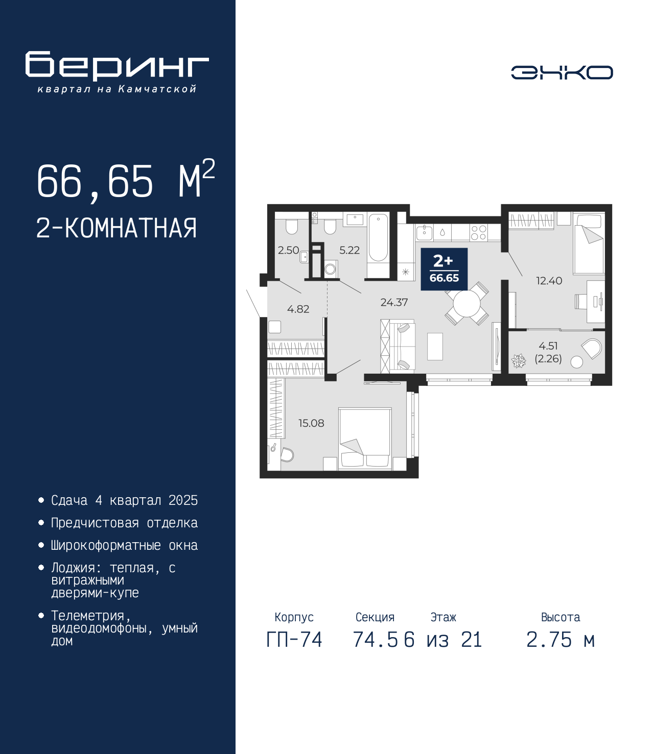 Двухкомнатная квартира от застройщика с предчистовой отделкой в ЖК "Беринг" на 6 этаже. Общая площадь: 66.65 кв.м., жилая: 27.48 кв.м., площадь просторной кухни-столовой: 24.37 кв.м. Угловая квартира, очень светлая, естественная вентиляция при открытии окон. В квартире одна лоджия, один совмещенный и один раздельный санузел. Высота потолков 2.75 м. Дом монолитный, многоподъездный, переменной этажности, от 9 до 21 этажей. Квартира находится в 74.5-й секции высотой 21 этаж в корпусе ГП-74. На этаже 7 квартир. В подъезде 1 пассажирский и 1 грузовой лифт. Окончание строительства - 4 квартал 2025 года. Оформление сделки по договору долевого участия. Подобно знаменитому исследователю, мы чувствуем себя первооткрывателями этой локации. Хотим показать новую суть места, сформировать для вас жизненный опыт, которого ещё не было. Беринг — район зелёного цвета. Беринг — район, который откроется вам с другой стороны. Впечатлит новым уровнем комфорта и качеством жизни. Беринг — открытие на карте города. Первый квартал расположен в районе Тура, в границах улиц: Камчатская – Западносибирская – Энтузиастов. Вокруг уже есть всё для того, чтобы ежедневная рутина была лишь частью жизни и не доставляла дискомфорта. Школы и детские сады, магазины и аптеки, поликлиника, места для семейного отдыха, пеших и велопрогулок, и даже рыбалки. Масштабное озеленение дворов — визитная карточка ЭНКО и ваш оазис спокойствия, чтобы отвлечься от повседневности. Раскидистые деревья, кустарники, травы и цветы — осталось остановиться, вдохнуть и расслабиться, глядя на эту природную красоту. Стилистика подъездов продолжает концепцию Беринга, вдохновлённого Камчаткой: сдержанный, но при этом впечатляющий дизайн соседствует с удобством и функциональностью. (AQID02316141)